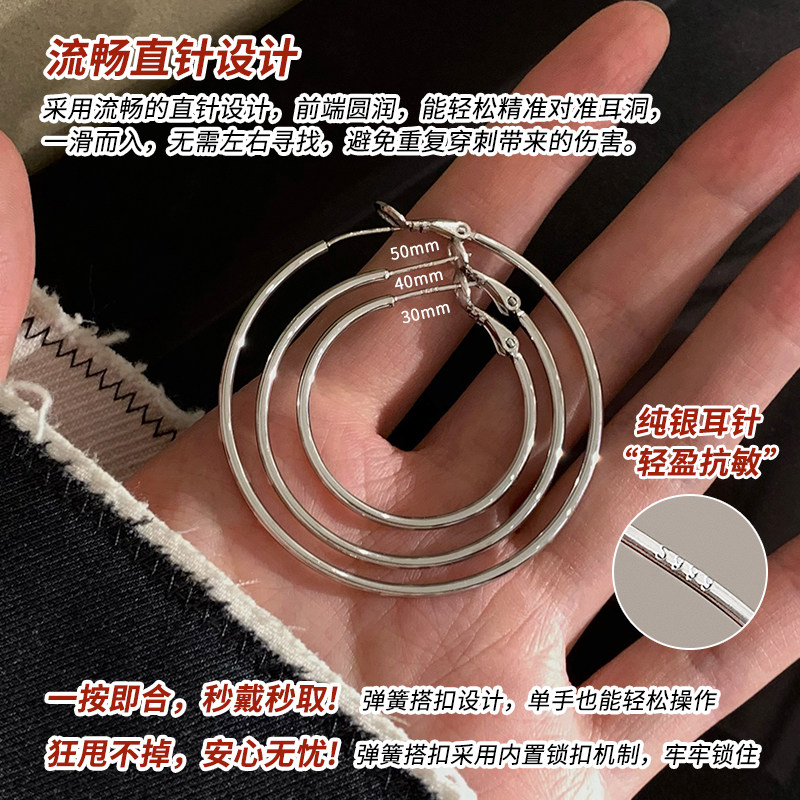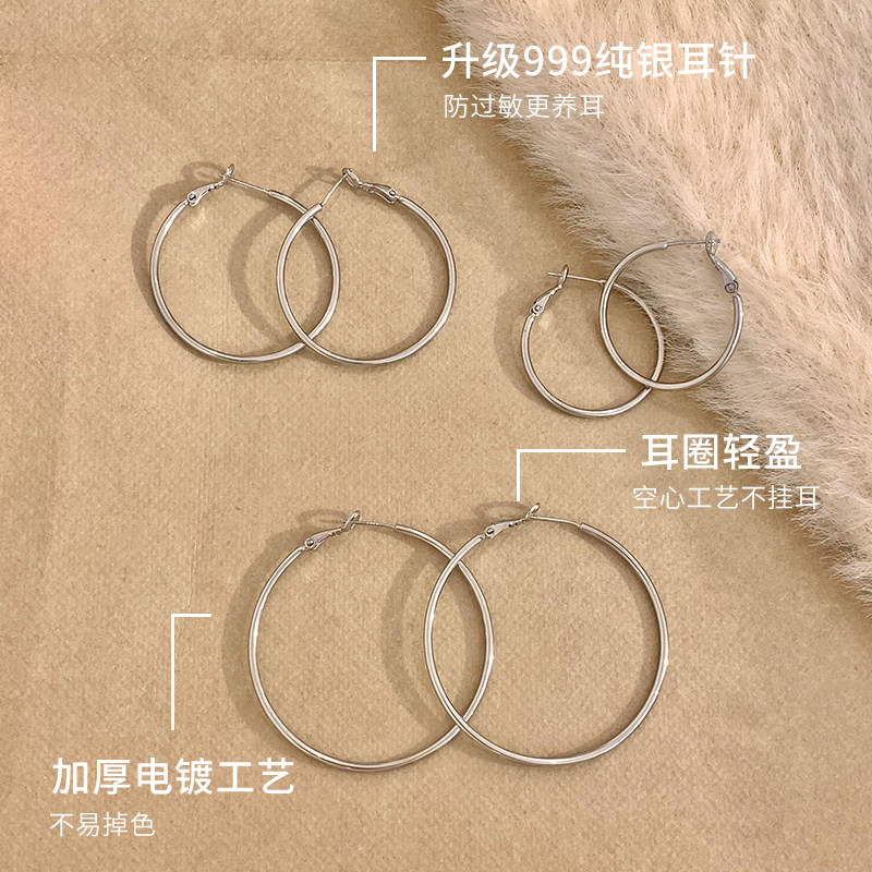 为晚S999纯银耳针大圆圈耳环高级感素圈2026新款爆款轻奢耳钉耳饰
