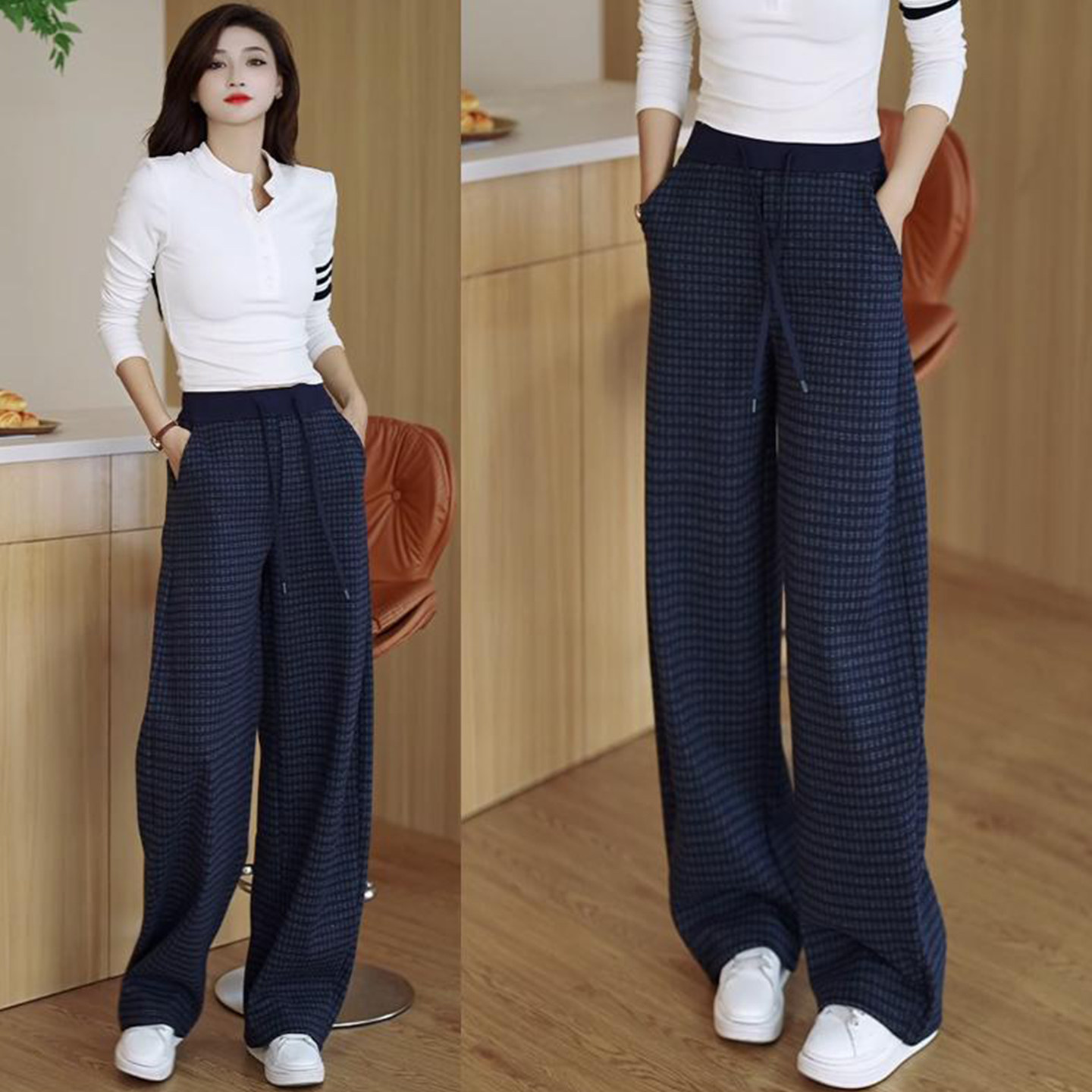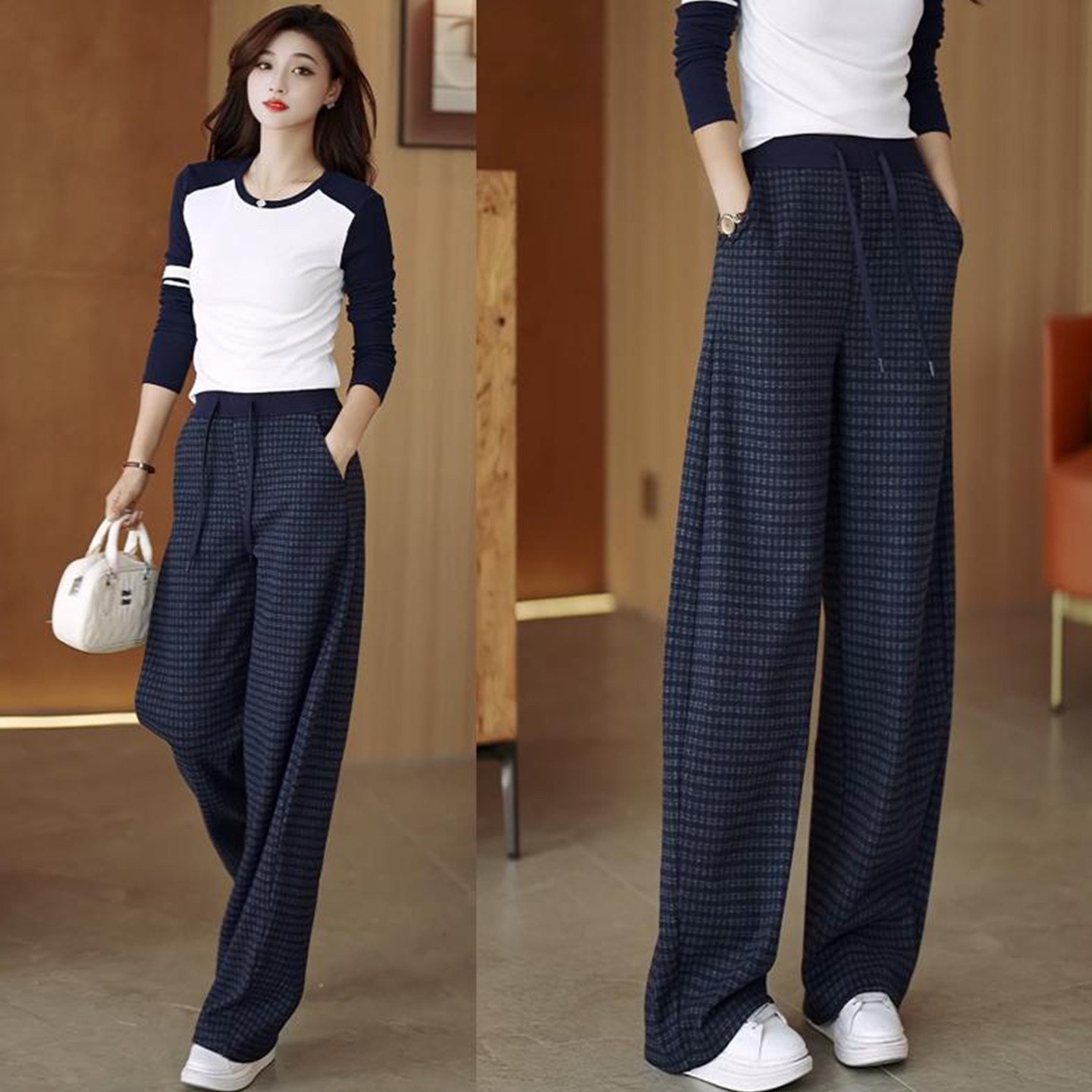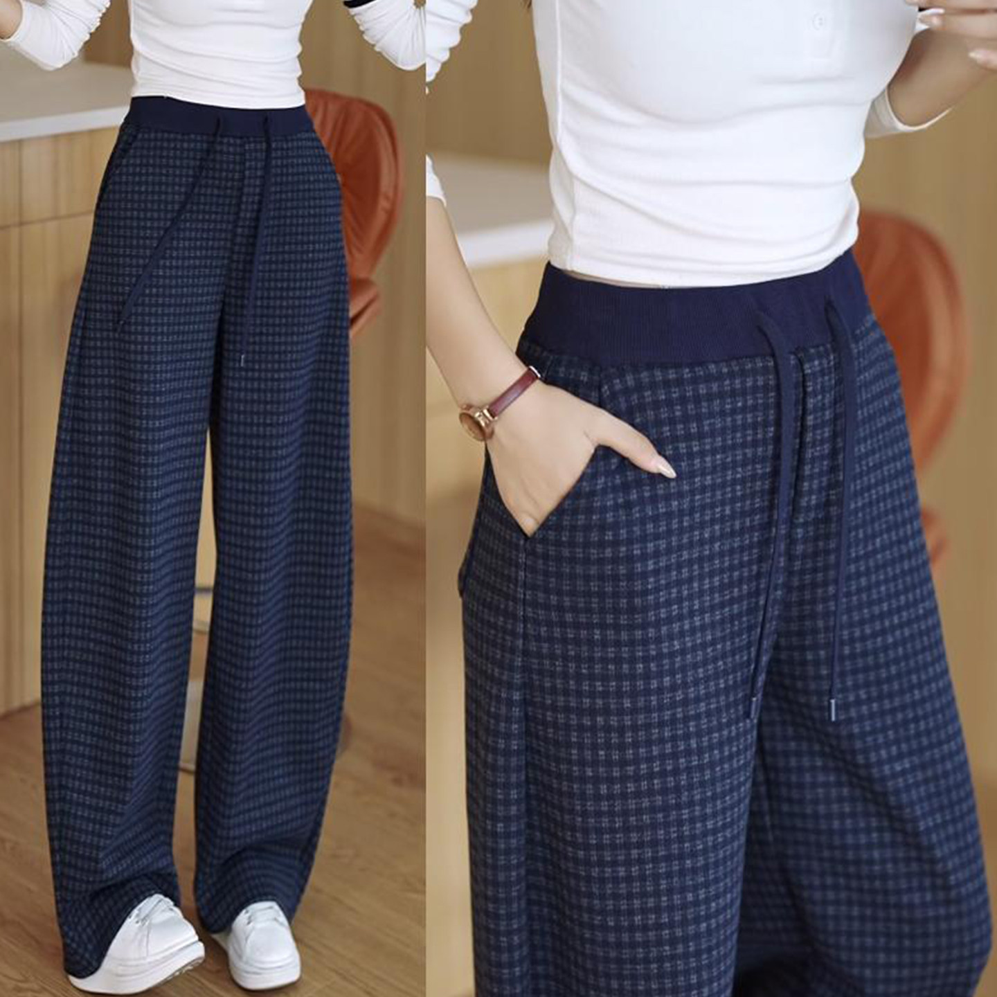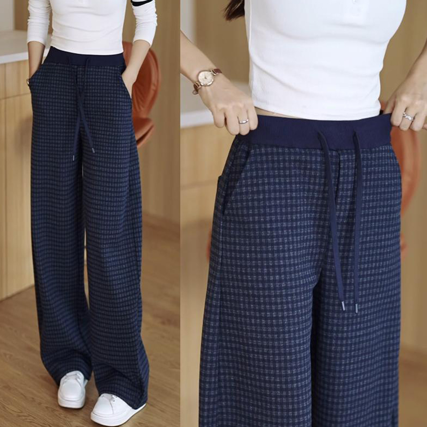 加绒加厚休闲阔腿裤女2025新款休闲裤高腰弯刀裤格子时尚秋冬裤子