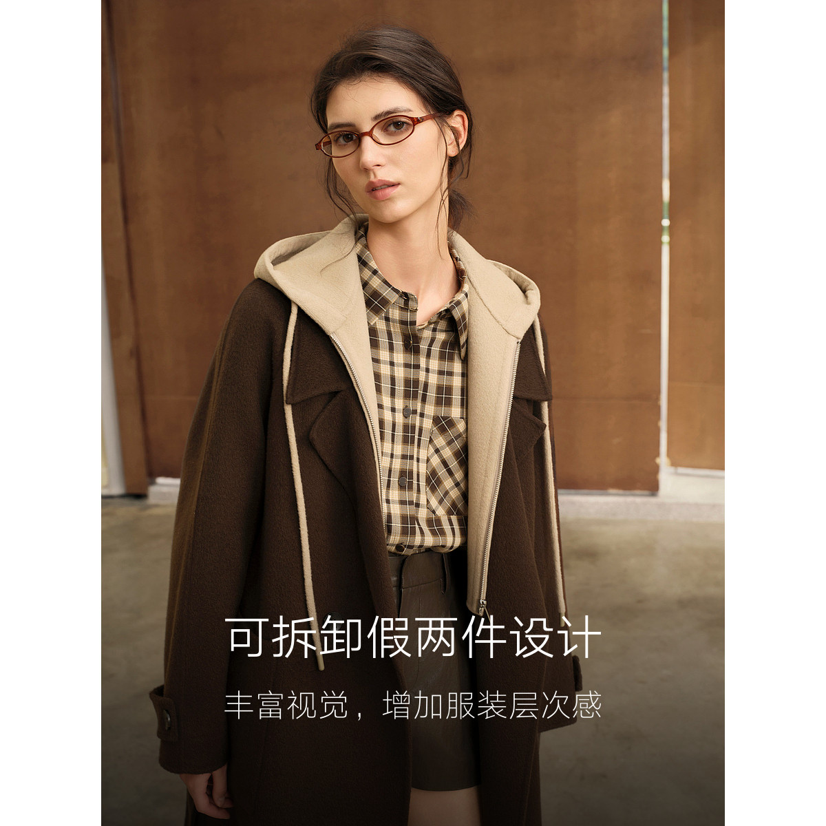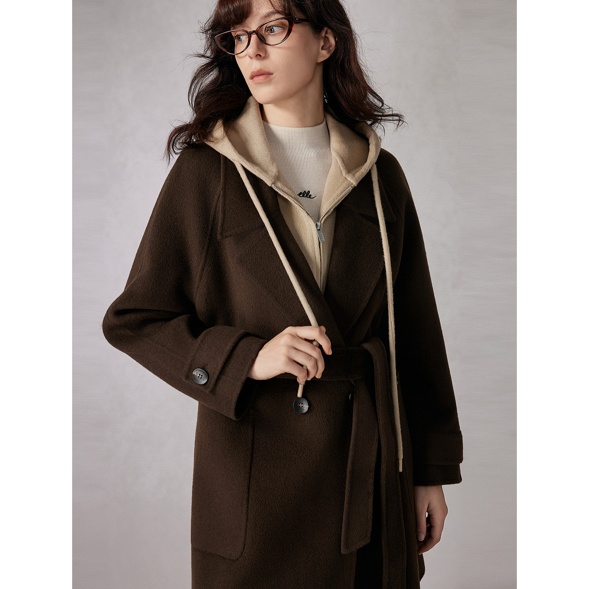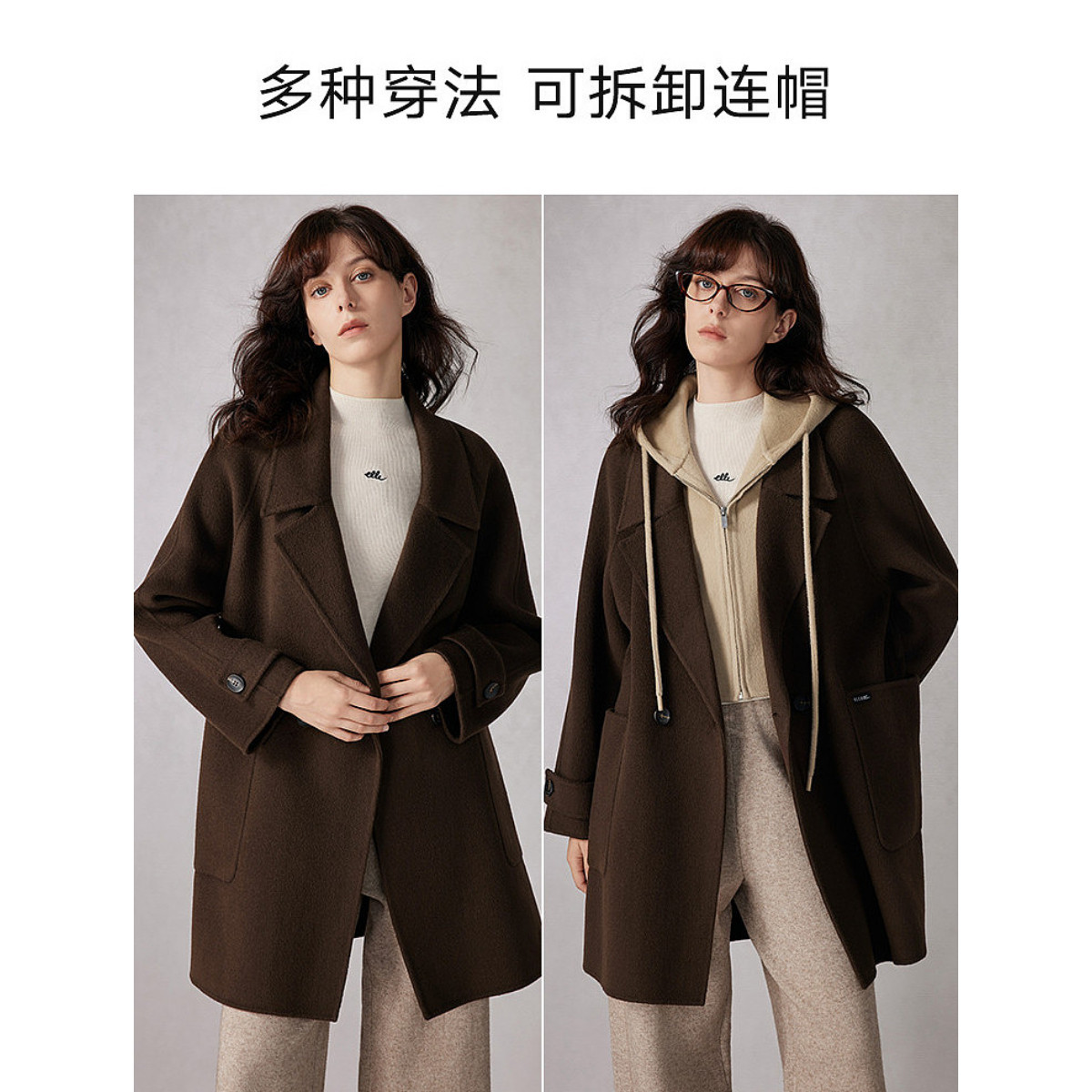 【山羊绒】ELLE假两件连帽双面呢大衣女25冬新款中长款毛呢外套