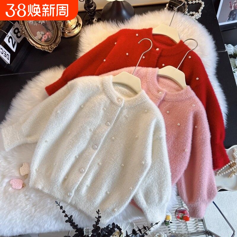 新年女童开衫毛衣水貂绒外套2026秋冬童装女宝宝毛毛上衣红色白色