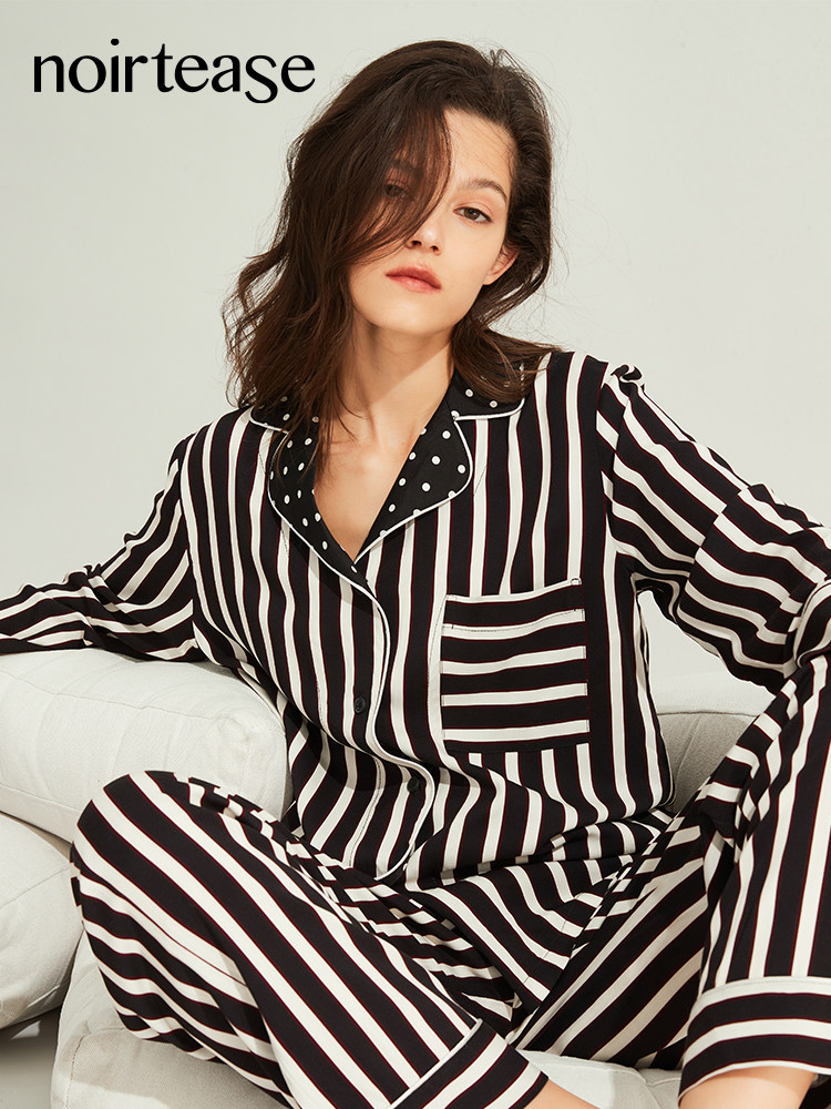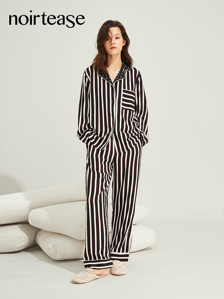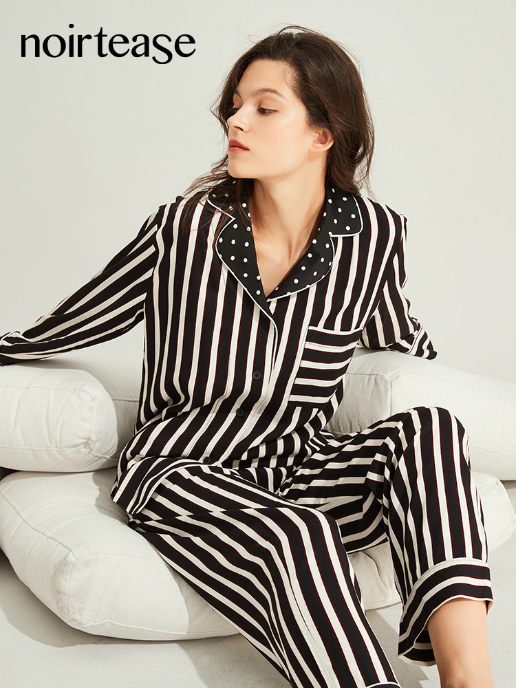 NoirTease奈黎诗春秋薄款条纹睡衣女士小翻领棉质家居服两件套装