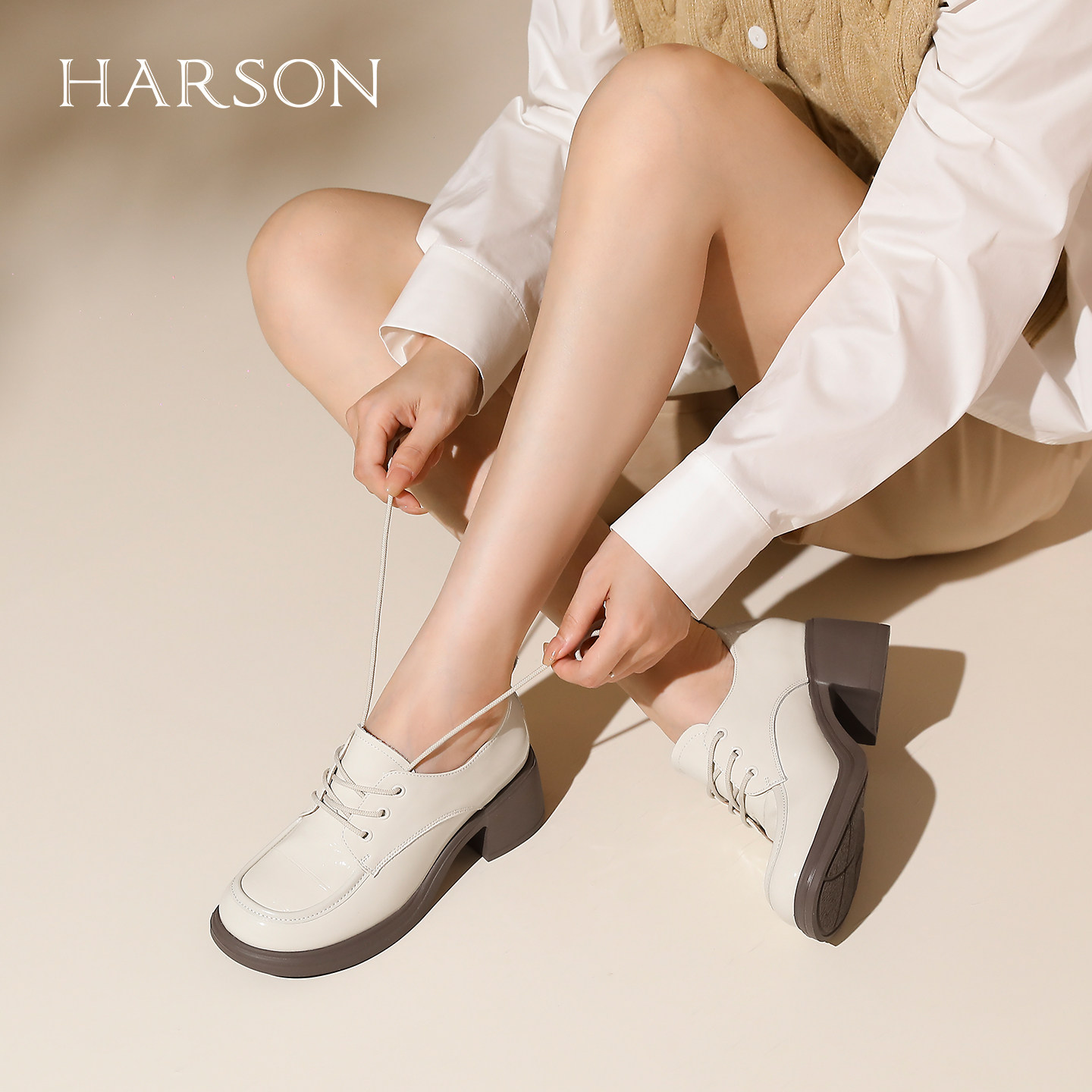 哈森英伦复古系带乐福鞋粗高跟皮鞋通勤上班女鞋2025秋HWL250121