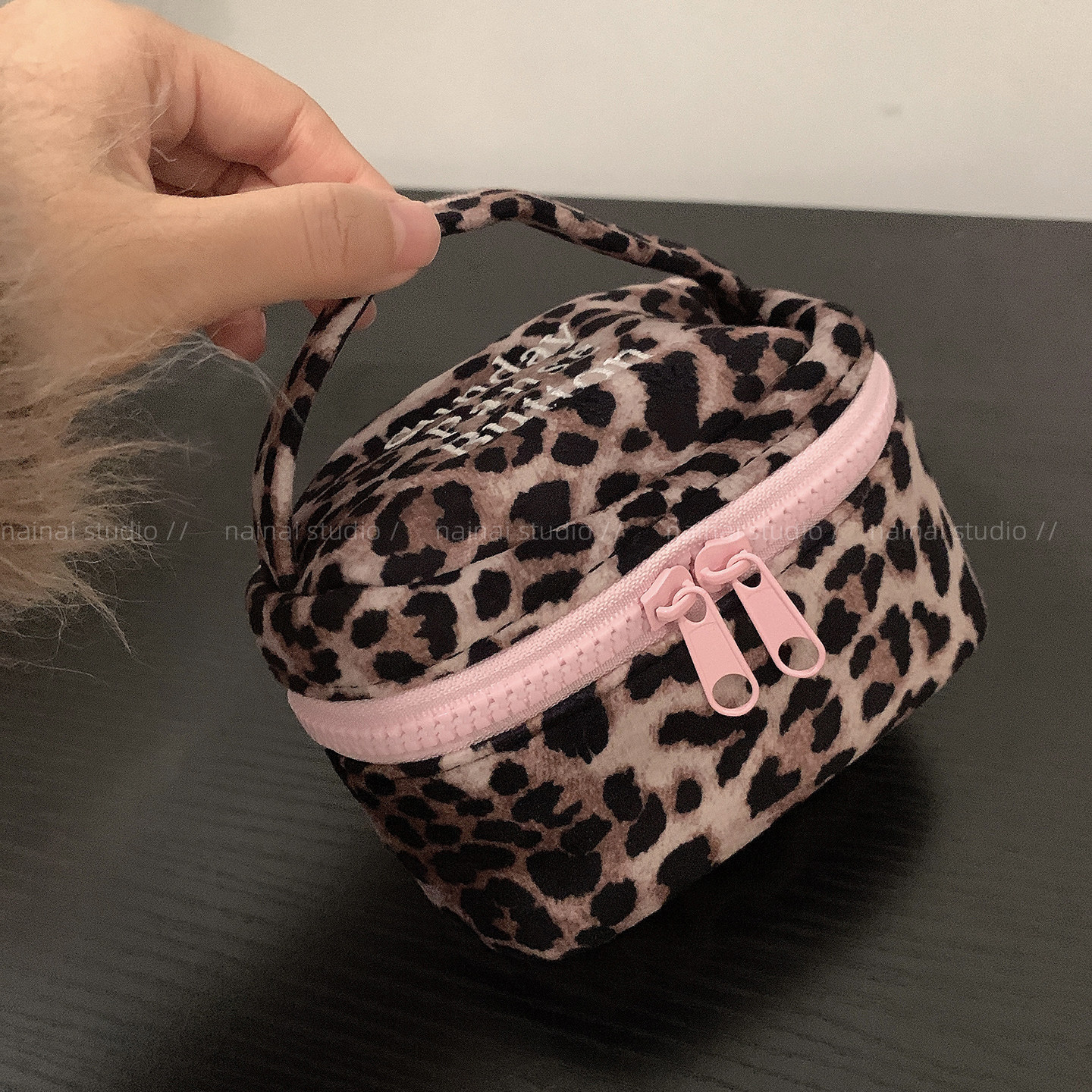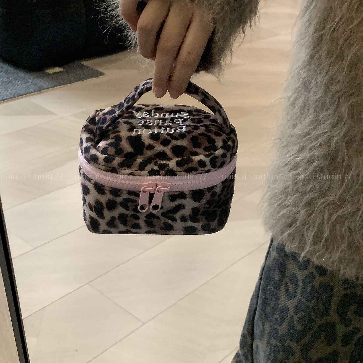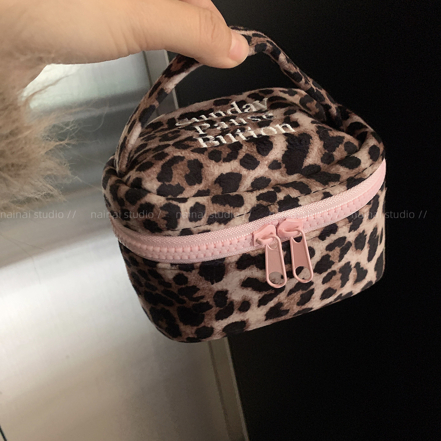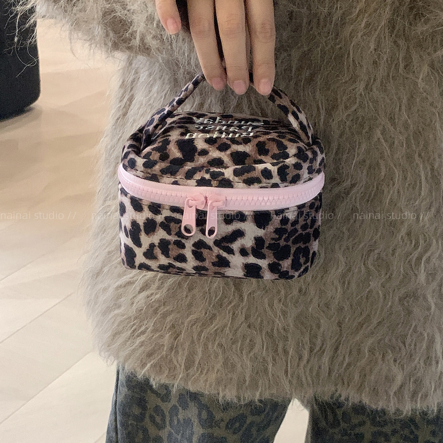 粉色豹纹包包~迷你立体化妆包收纳可爱便携旅行手提包随身零钱包