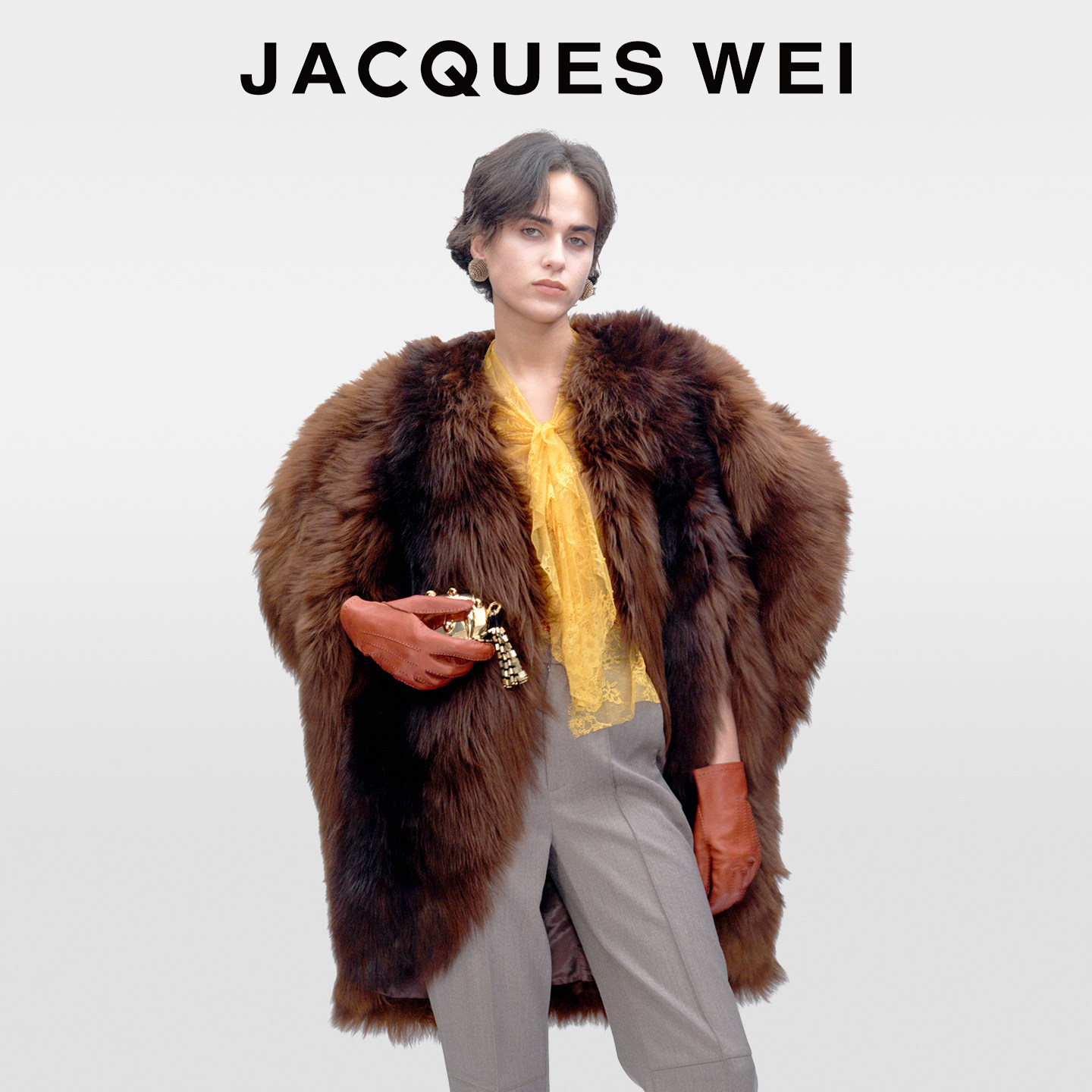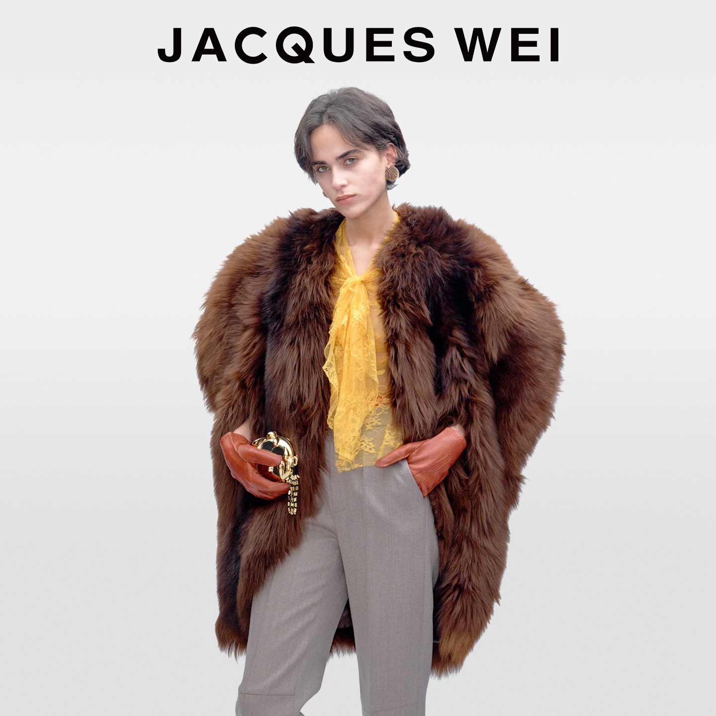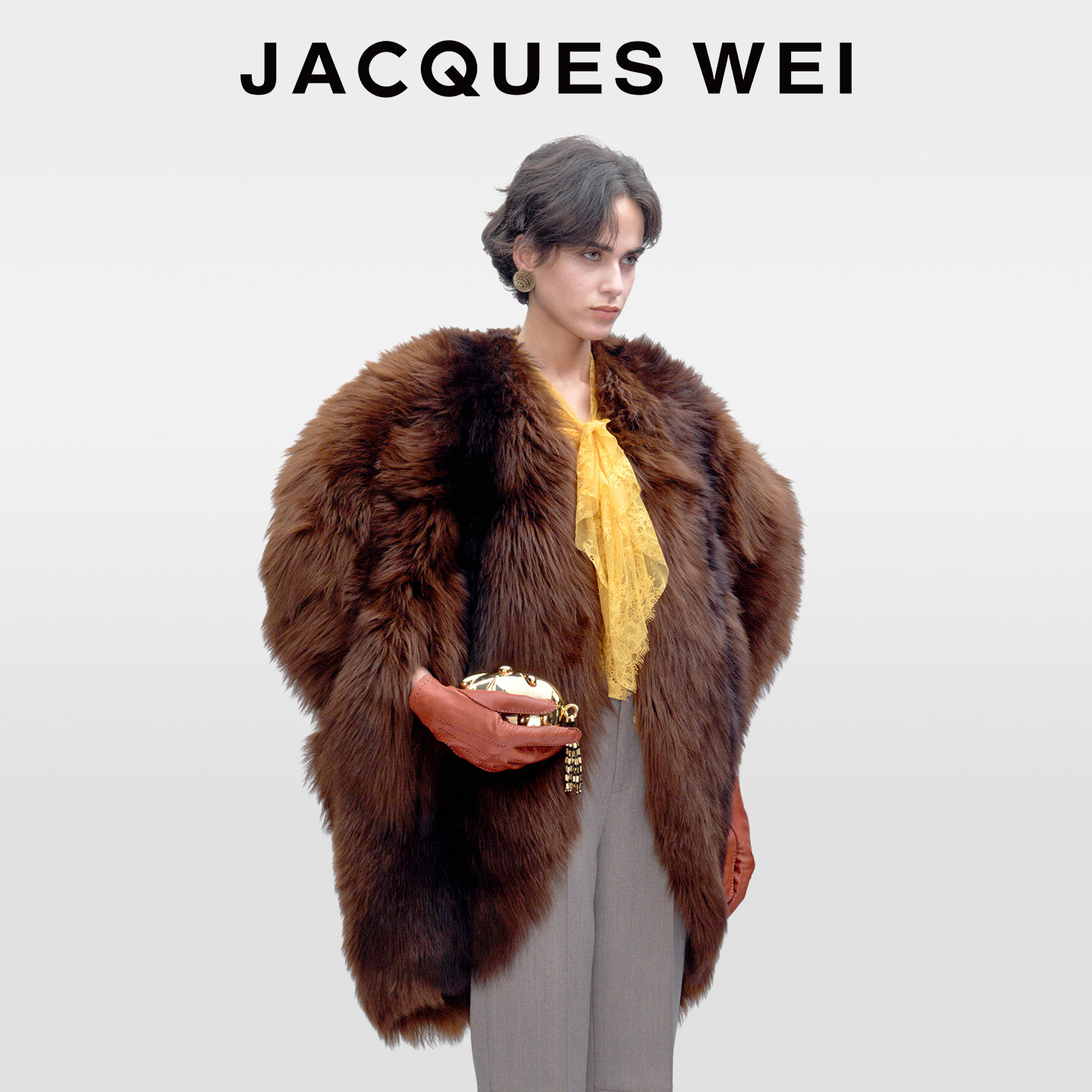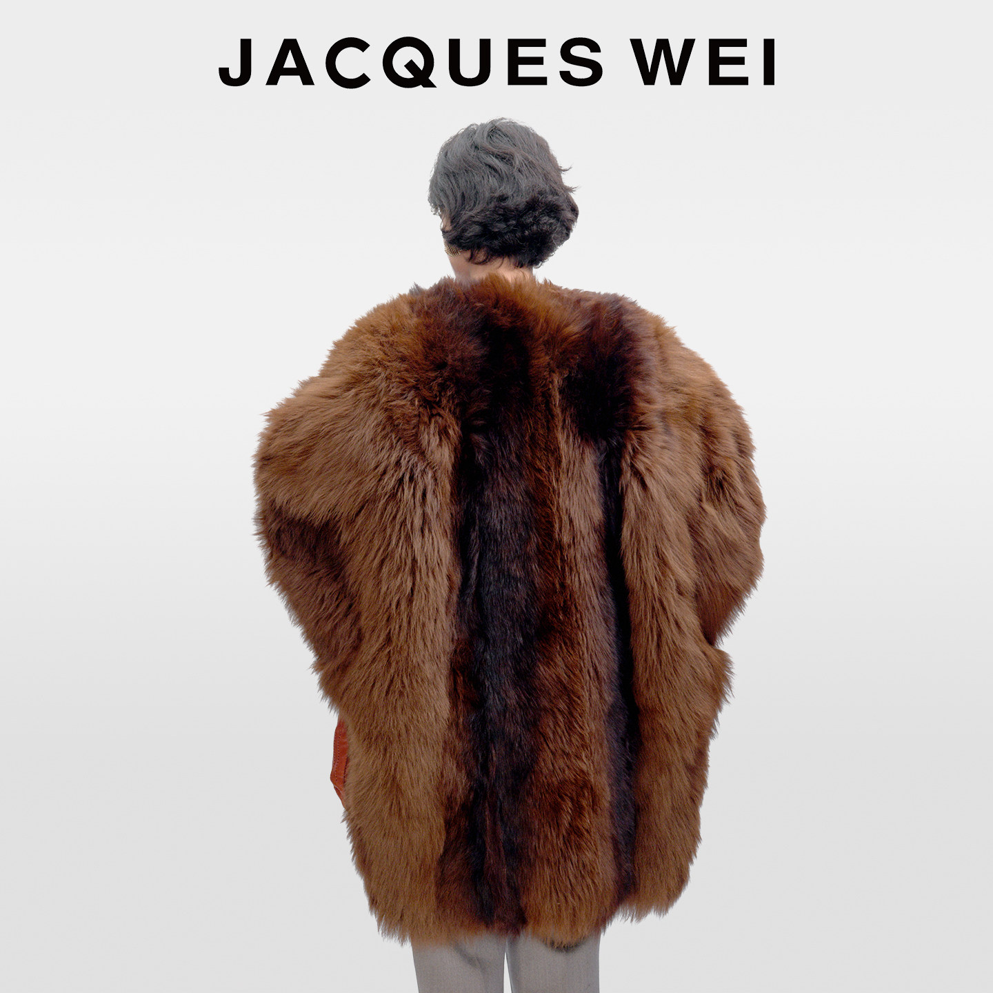 JACQUES WEI2025秋冬新款深棕色廓形无袖设计长毛皮草外套大衣女
