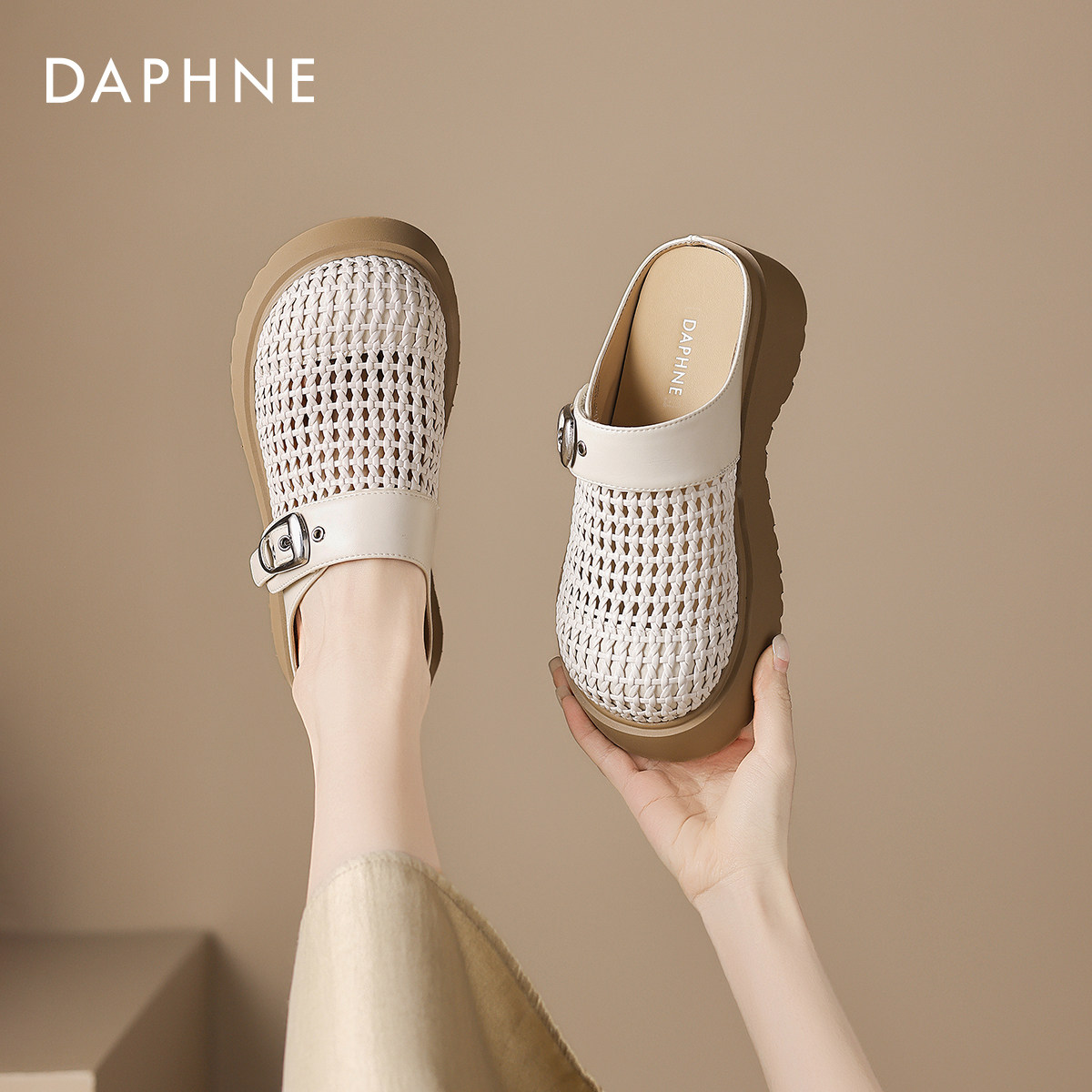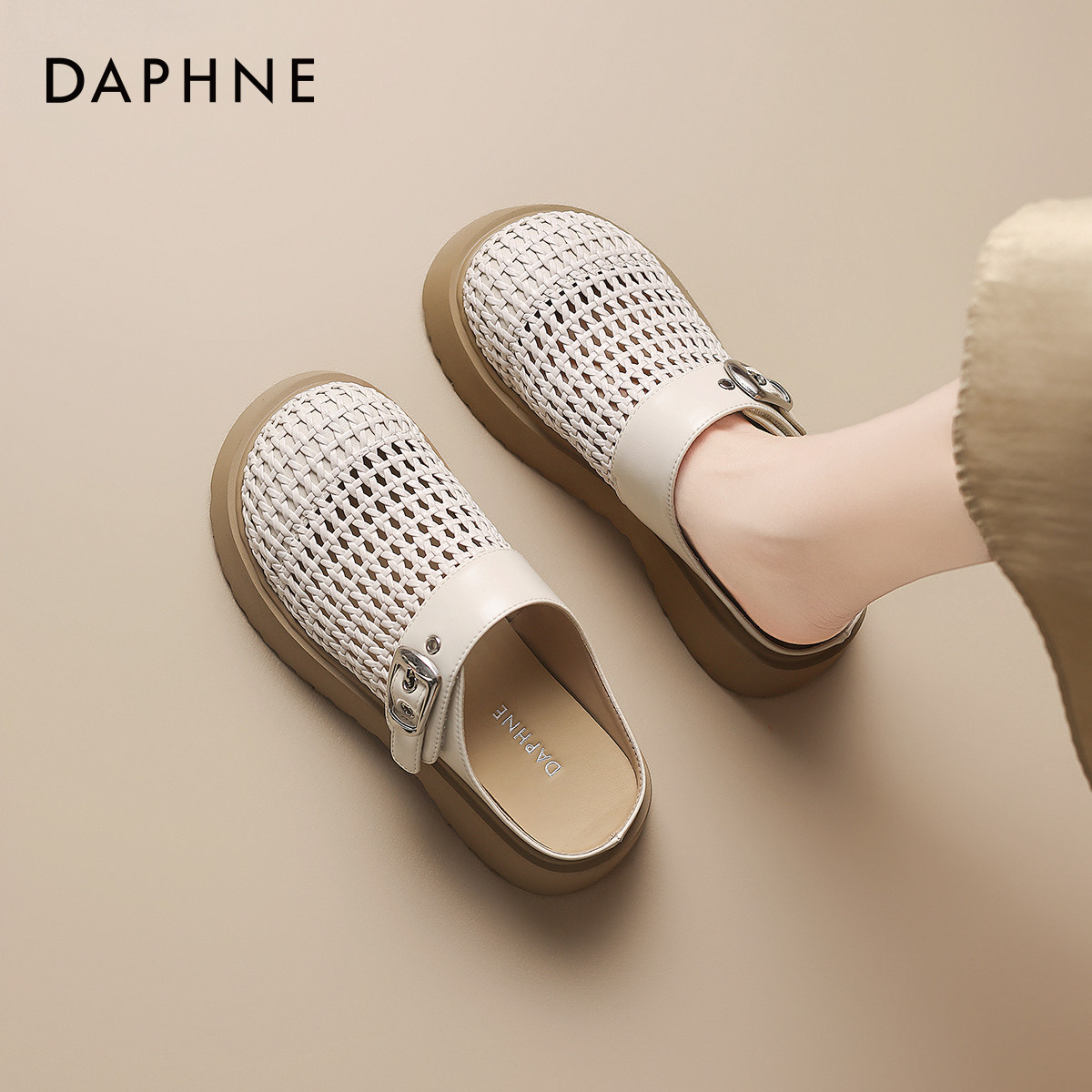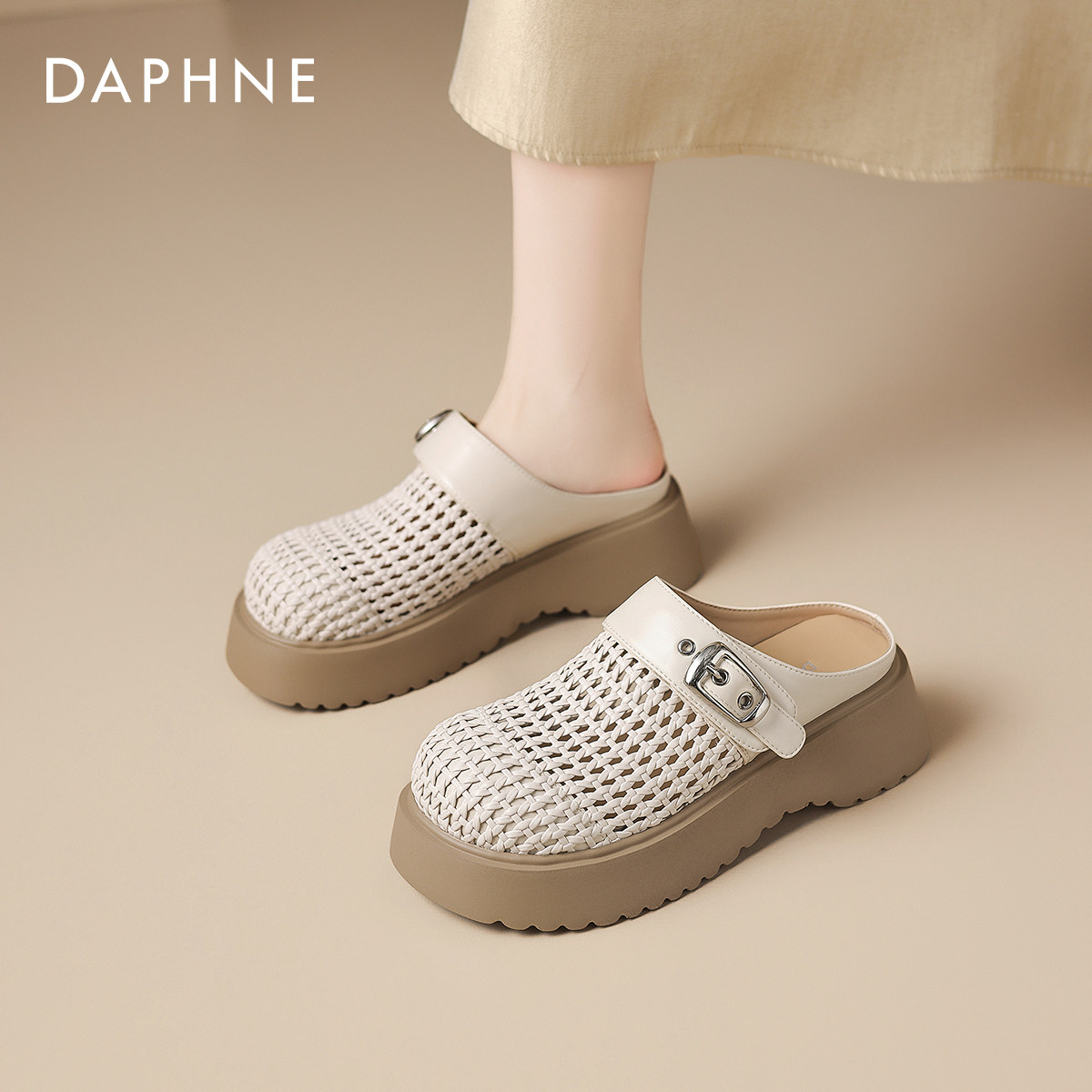 达芙妮厚底拖鞋女款夏季外穿2026新款包头半拖沙滩鞋编织镂空凉鞋