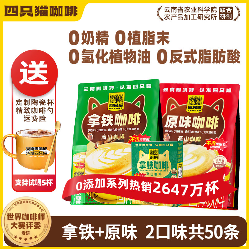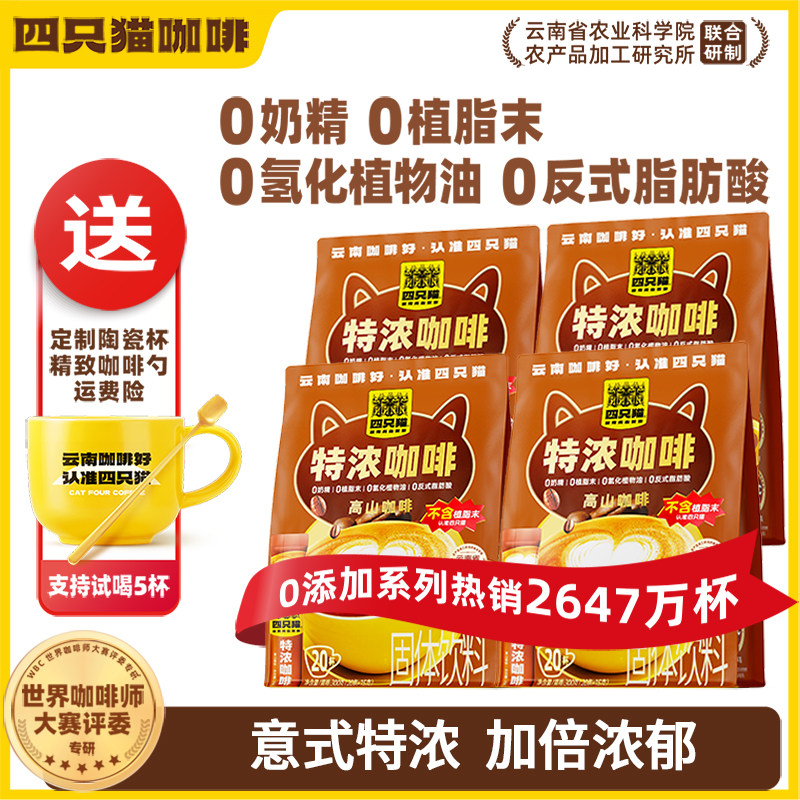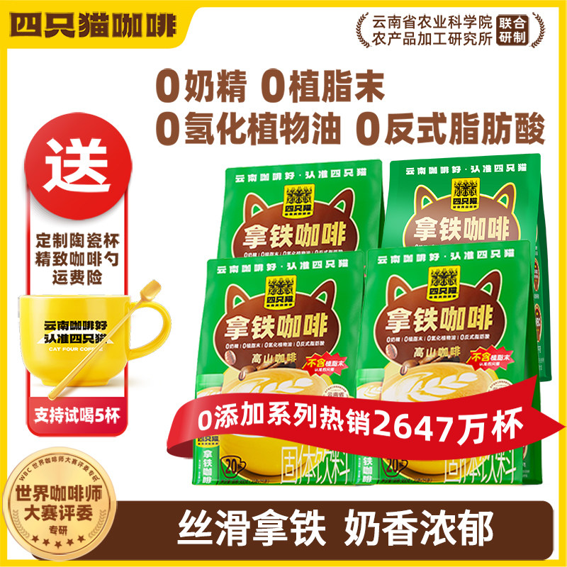 四只猫特浓速溶咖啡拿铁云南咖啡粉卡布三合一提神袋装植脂末奶香