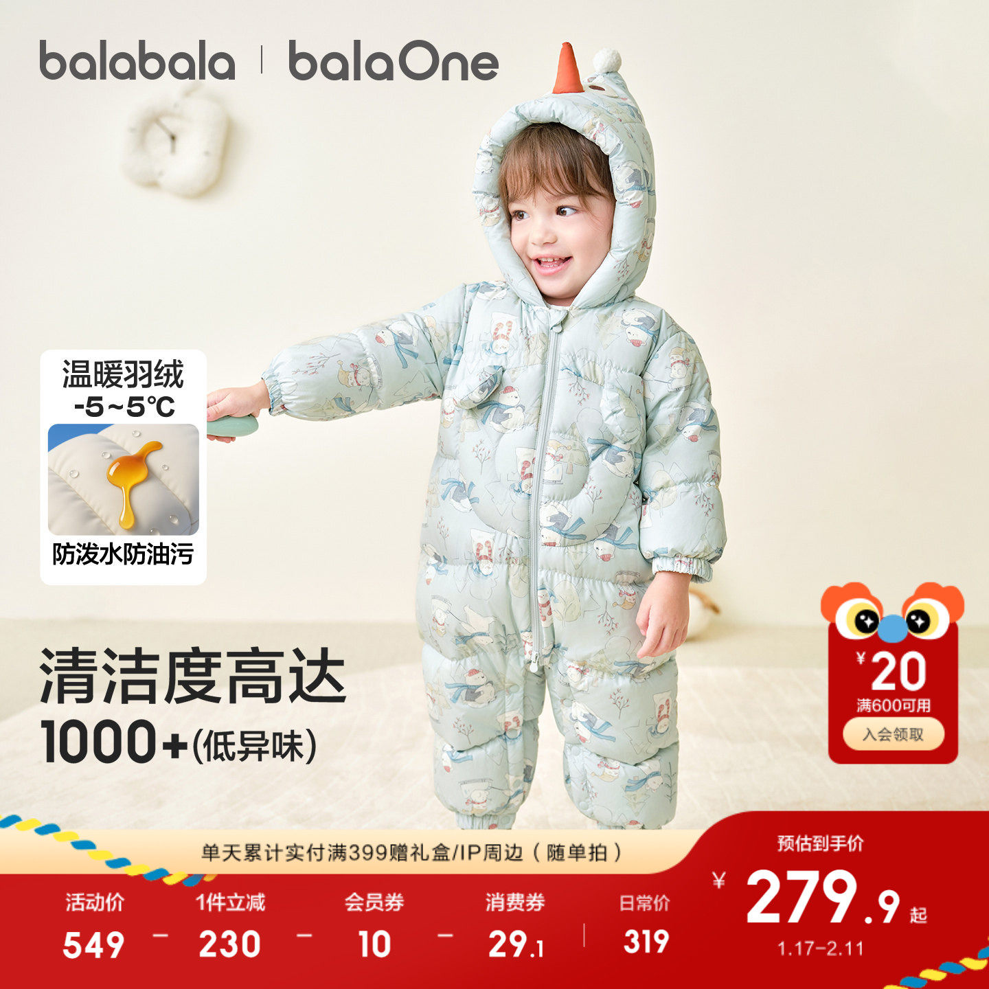 巴拉巴拉童装婴儿连体衣羽绒服宝宝衣服2025新款冬装连帽鹅绒爬服