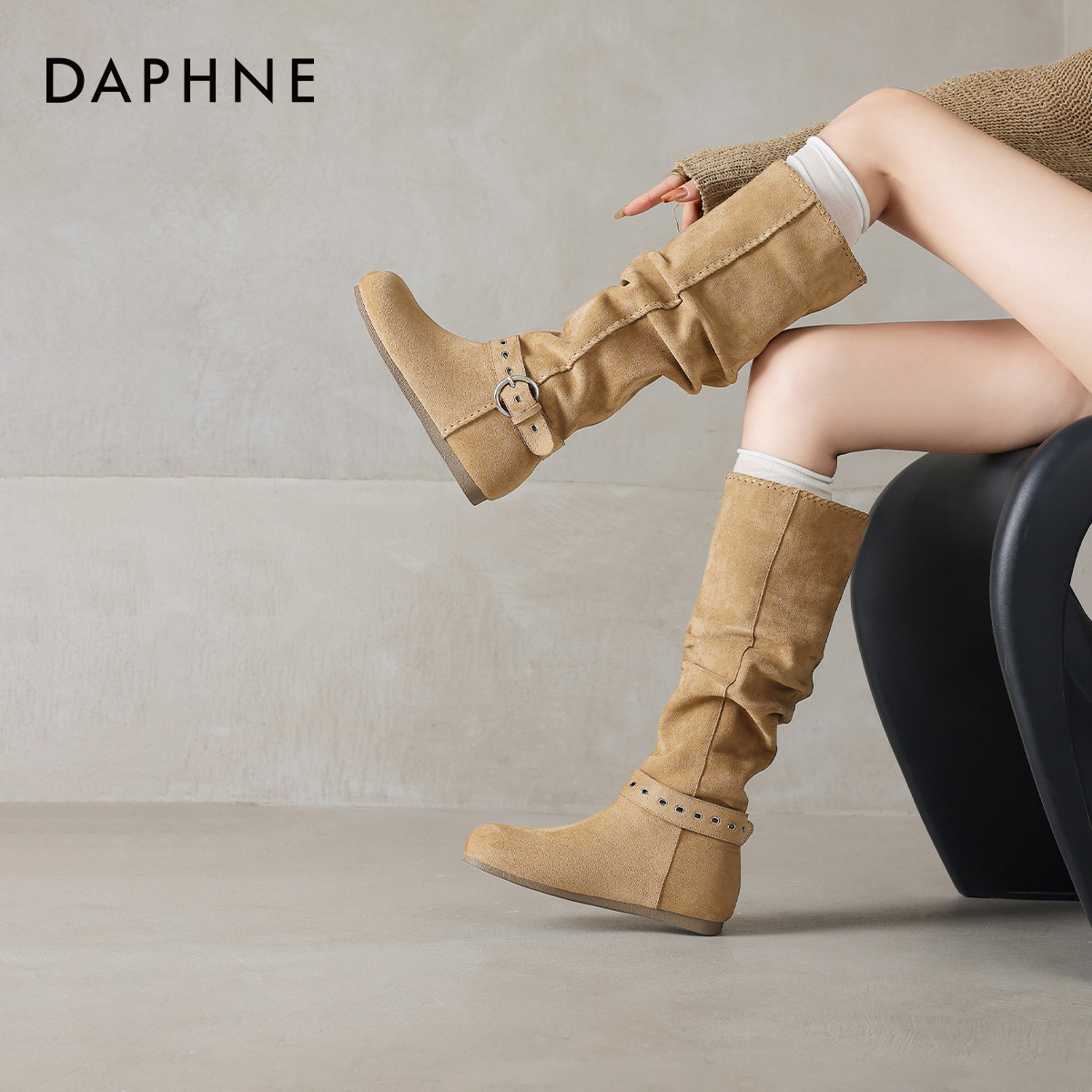 达芙妮美拉德长筒靴女2026新款冬圆头内增高西部牛仔靴春款堆堆靴