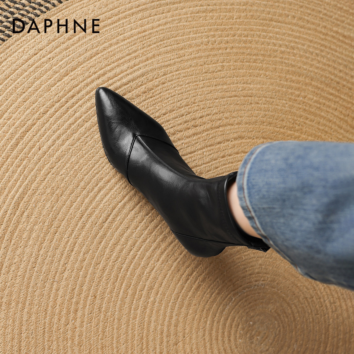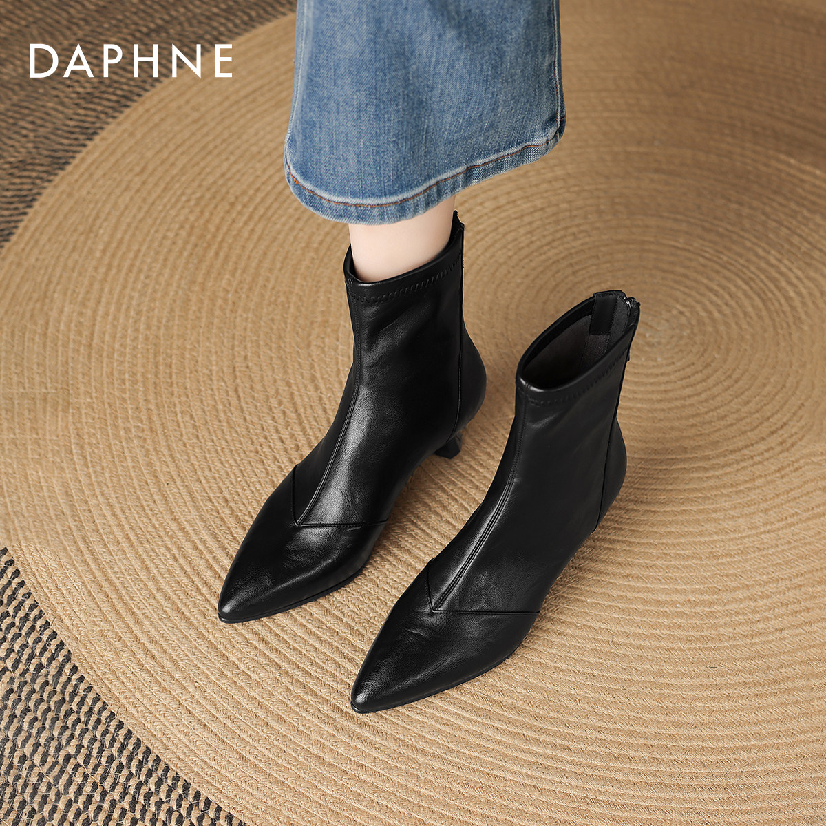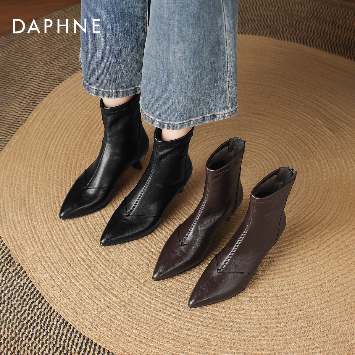 达芙妮尖头短靴女2025新款冬季棕色复古瘦瘦靴法式细跟高跟鞋踝靴