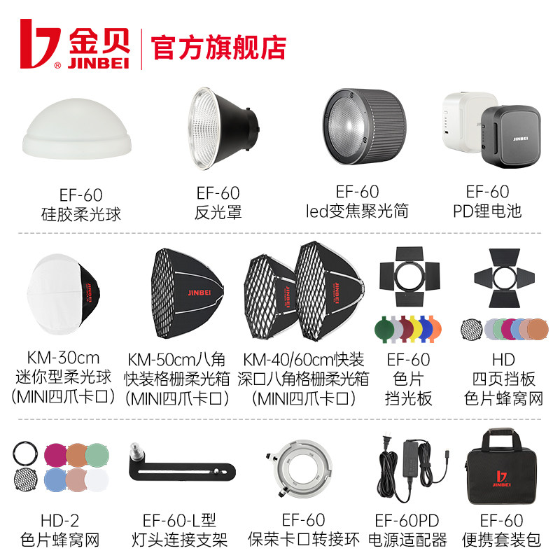 金贝EF60BI/RGB塑光附件柔光球蜂窝网色片反光罩四页挡板硅胶柔光球变焦聚光筒八角格栅柔光箱锂电池充电器