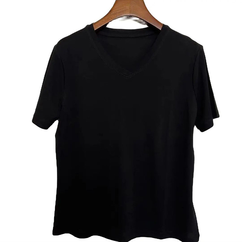 夏季亲肤透气加捻100%短袖桑蚕丝T恤黑色显瘦V字领时尚百搭休闲