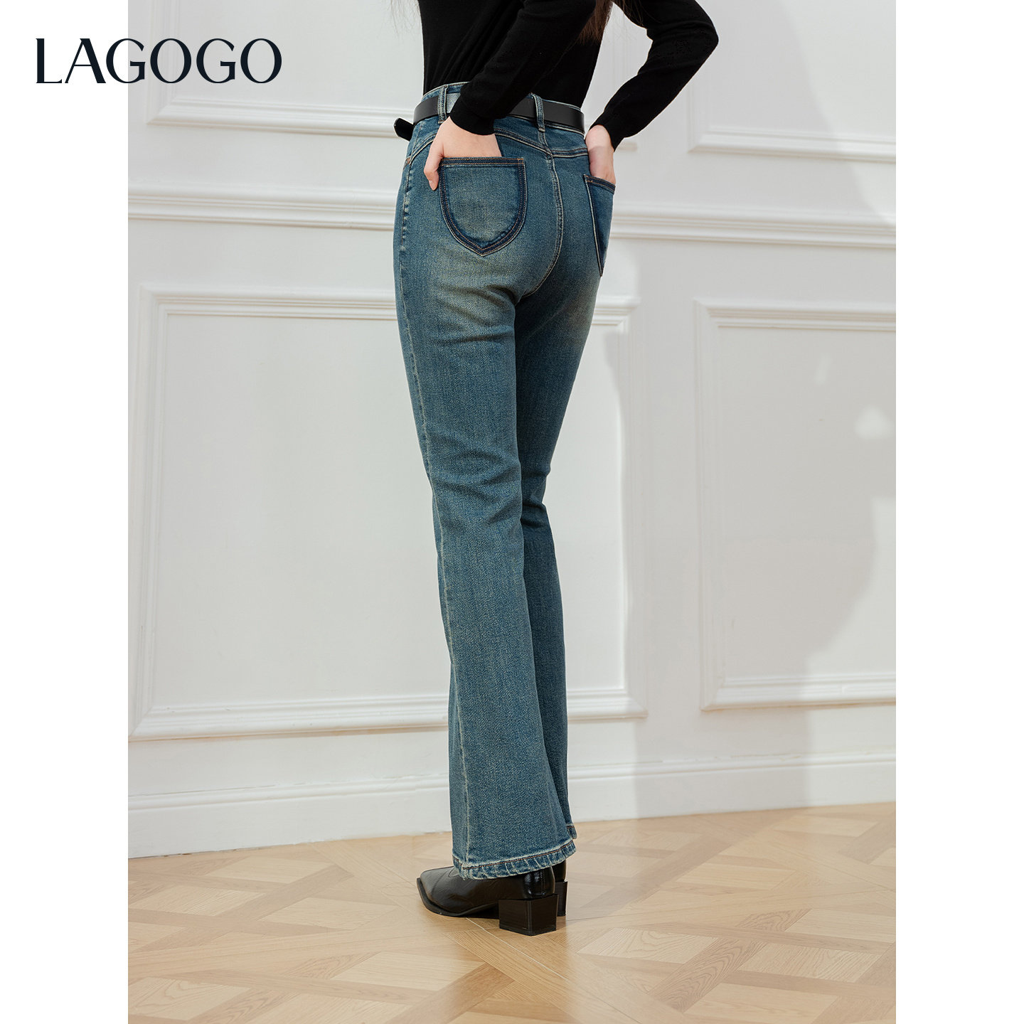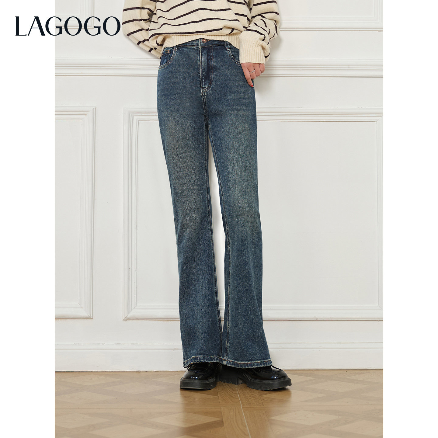 LAGOGO四面弹微喇牛仔裤女拉谷谷2025冬季新款复古修身显瘦马蹄裤