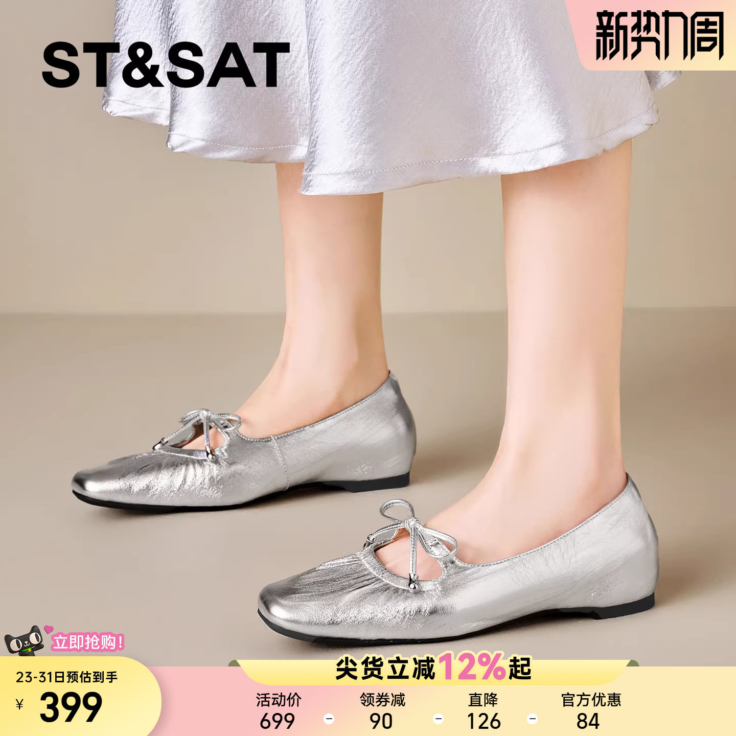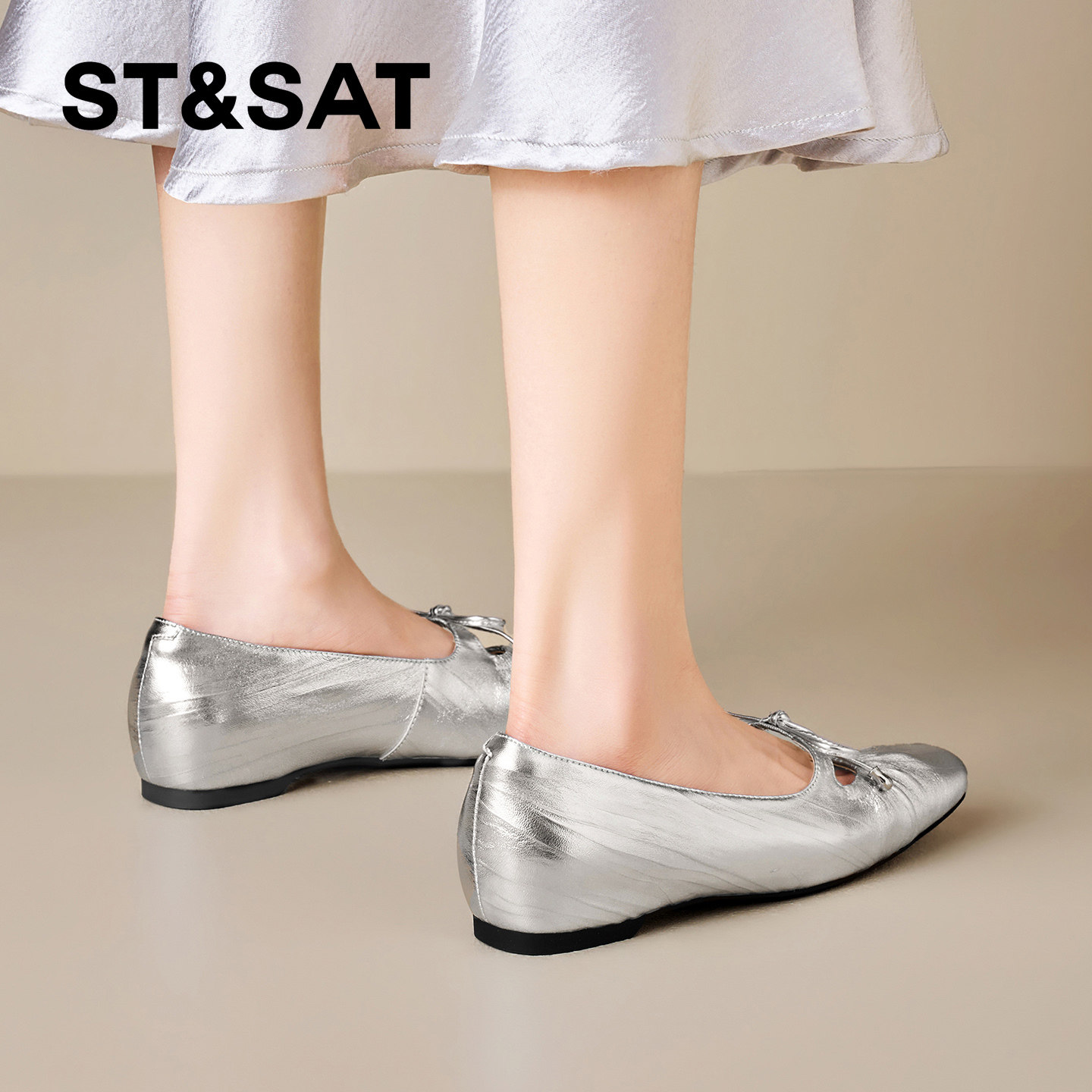 羊皮版~银色玛丽珍鞋女春平底配裙子一字带法式芭蕾单鞋大码女鞋