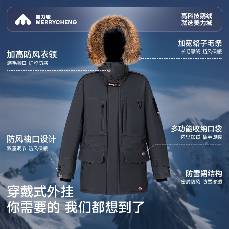 【檀健次同款】美力城鹅绒羽绒服黑色毛领中长款保暖外套男女新款