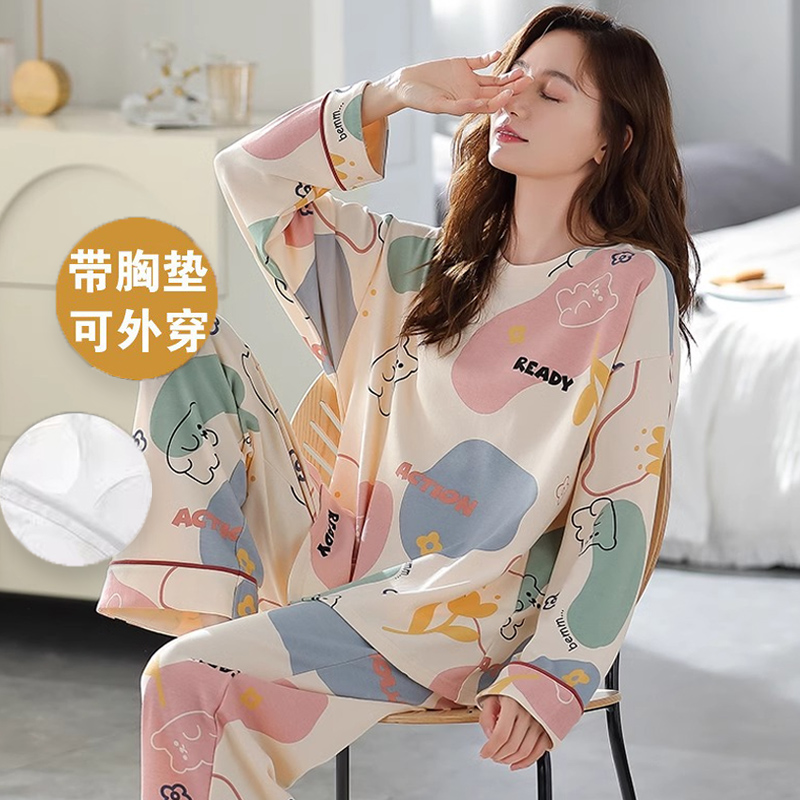 2025新款带胸垫睡衣女春秋款女士套装家居服休闲可外穿长裤柔软