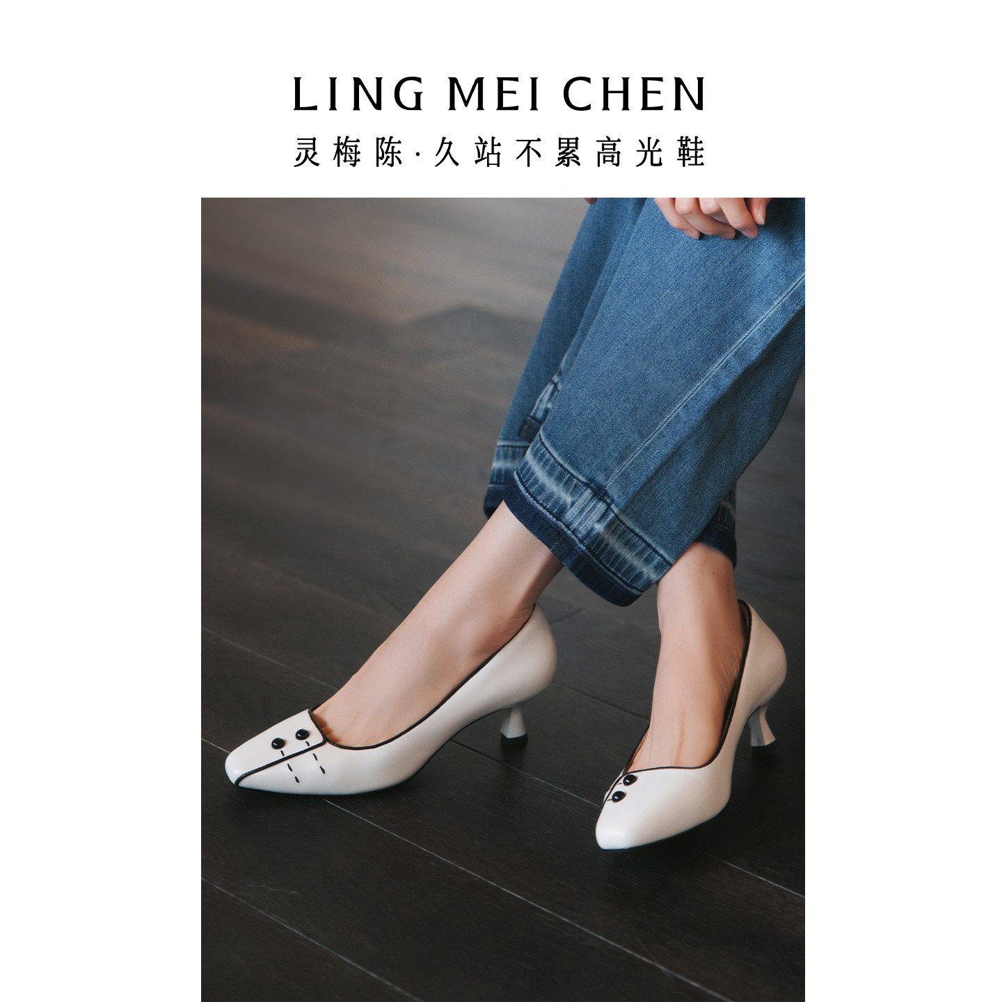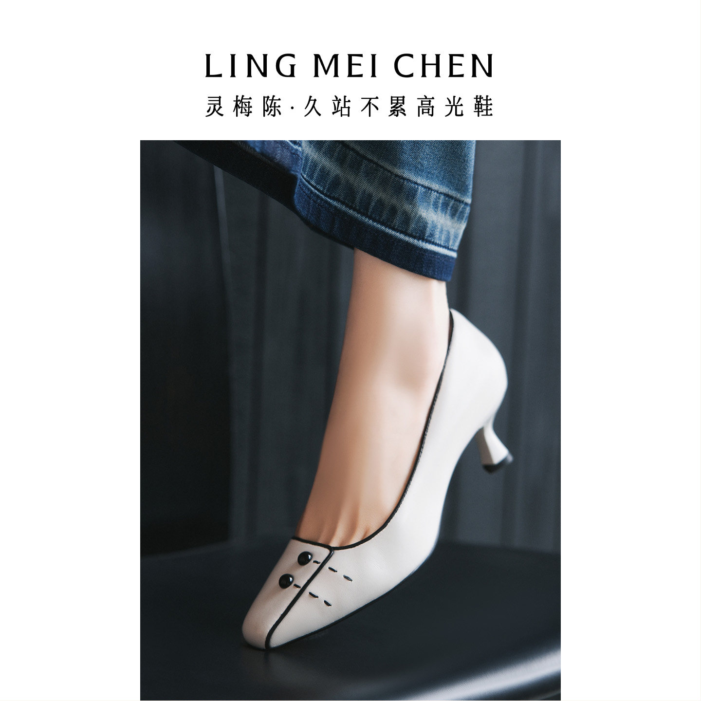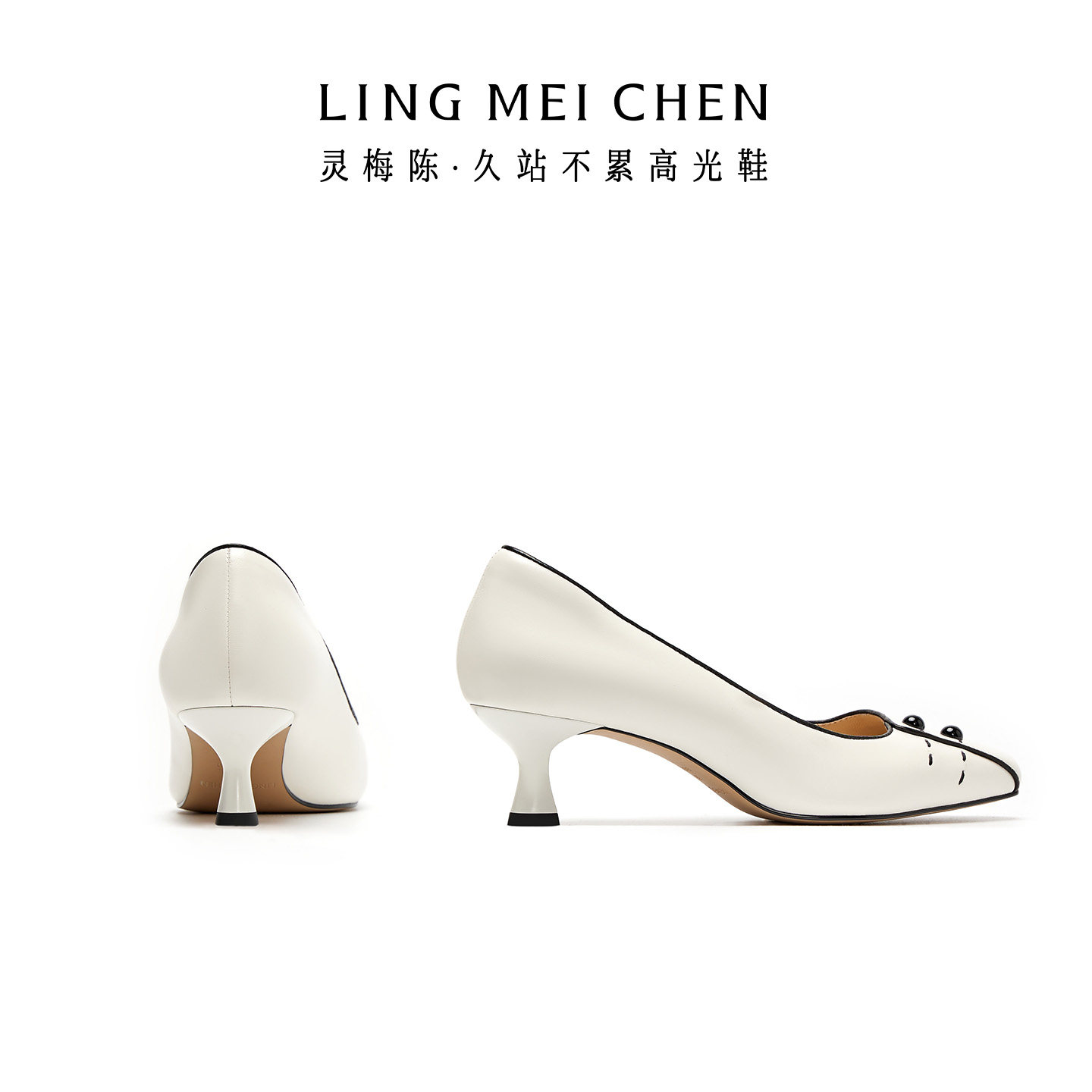 LINGMEICHEN新中式围棋白色高跟鞋2026新款低跟鞋羊皮女鞋旗袍鞋
