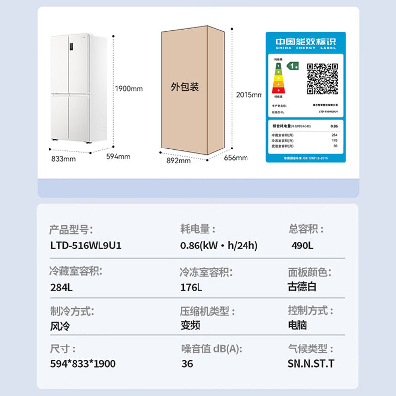 海尔智家出品冰箱490L奶油风十字对开门516零嵌入式594mm一级能效