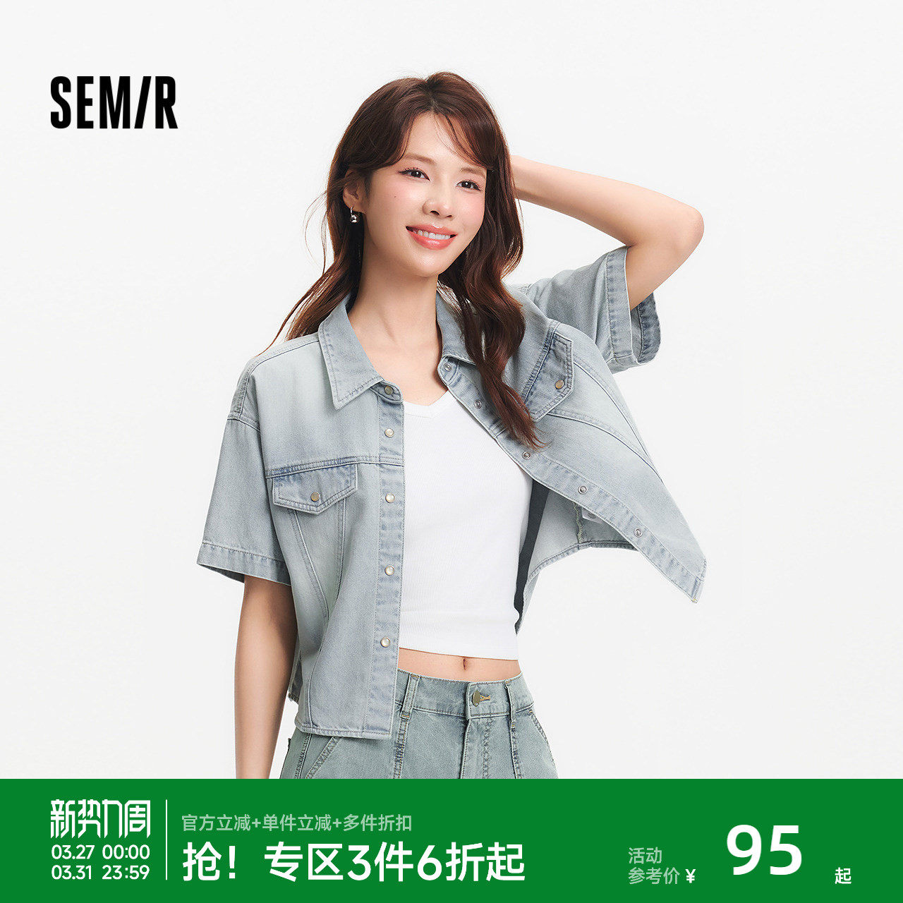 森柔|森马牛仔衬衫女夏短款落肩宽松分割显瘦甜酷小个子街头衬衣