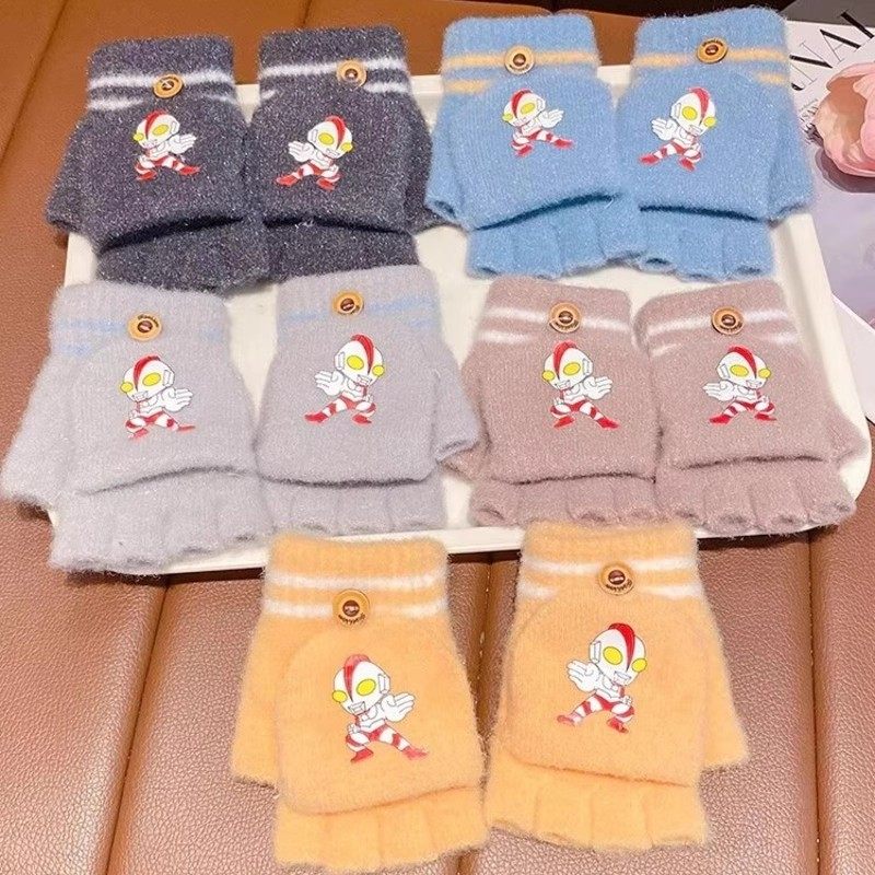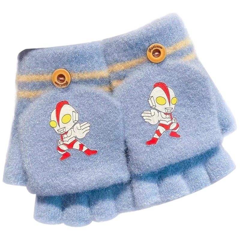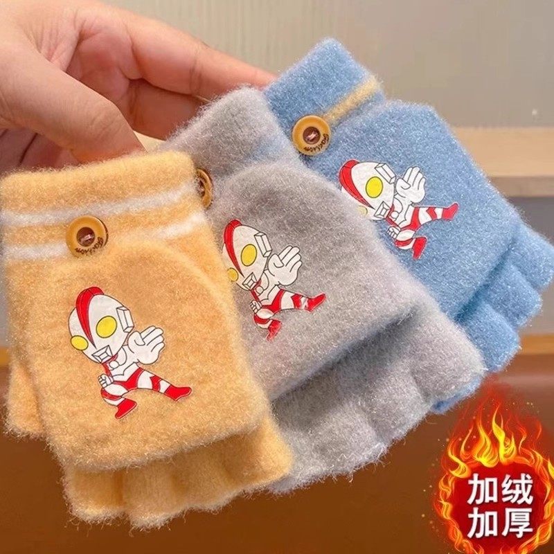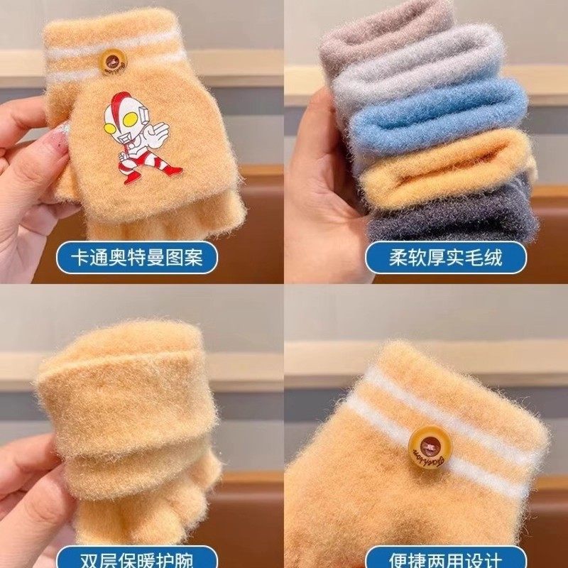 卡通加厚翻盖手套儿童秋冬季防风保暖手套男女学生写字半指手套