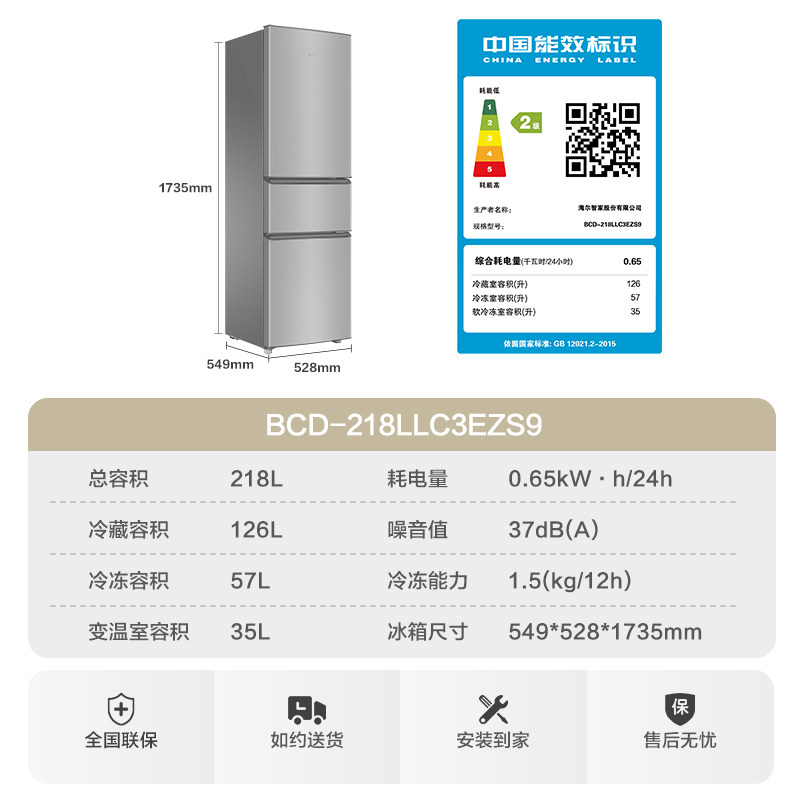 换新补贴海尔出品统帅218L三门节能租房宿舍家用超薄小冰箱官方