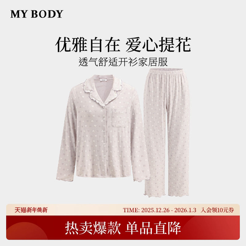 商场同款MYBODY秋季睡衣女轻磨毛甜美荷叶边领爱心提花长袖家居服