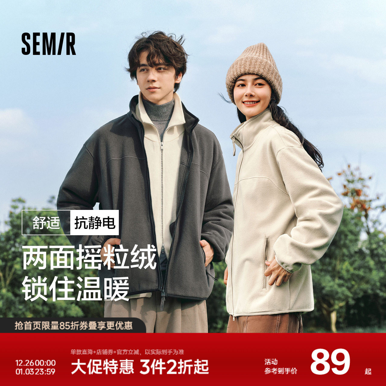 森马夹克男2024秋季新款抗静电毛绒外套保暖摇粒绒立领上衣情侣款