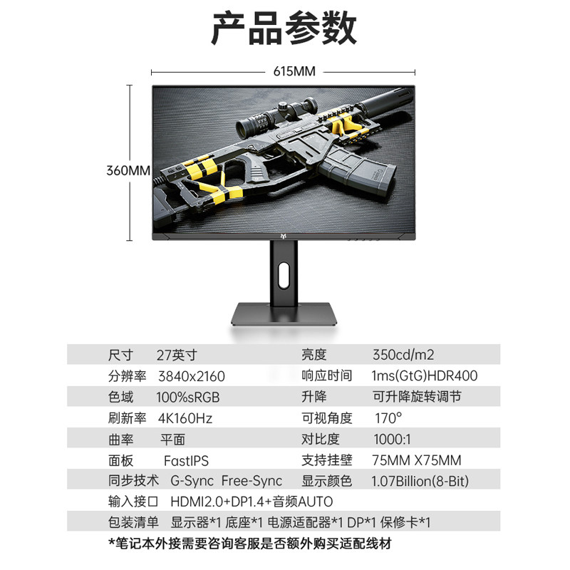 电竞显示器27英寸4K160HZ高刷FASTIPS快速液晶电脑游戏高清显示屏