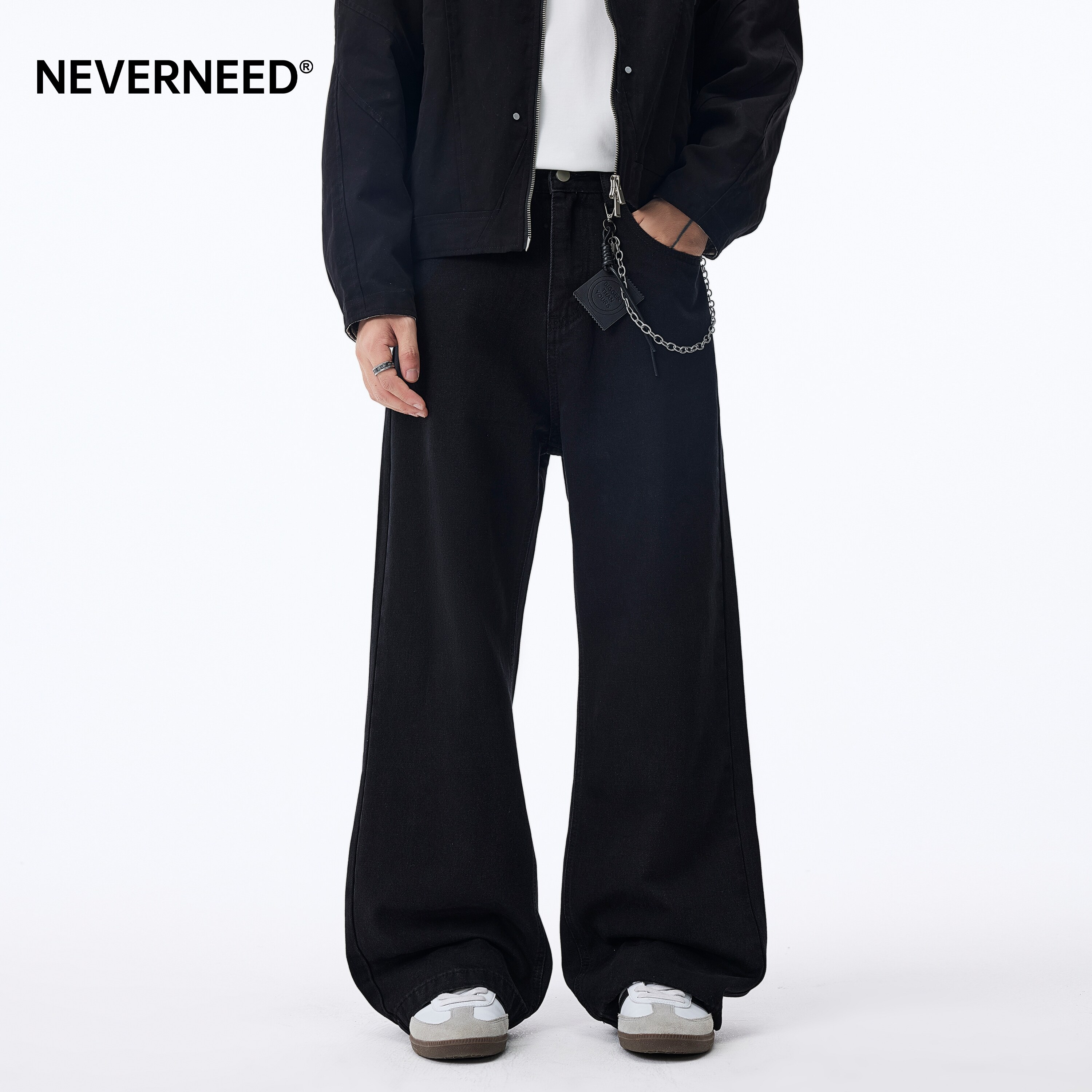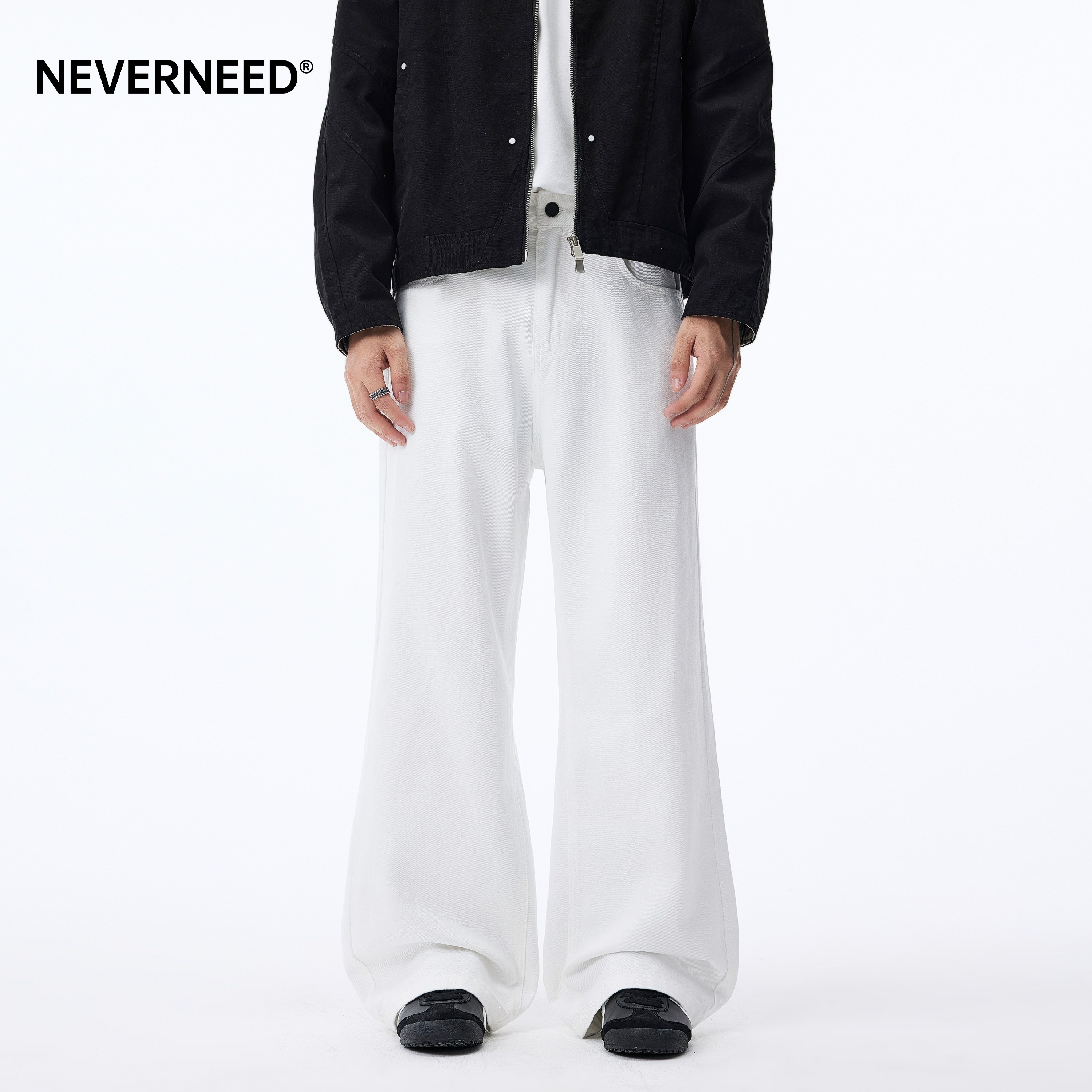 NEVERNEED白色宽松直筒牛仔裤男女秋冬季加绒美式休闲A字阔腿长裤
