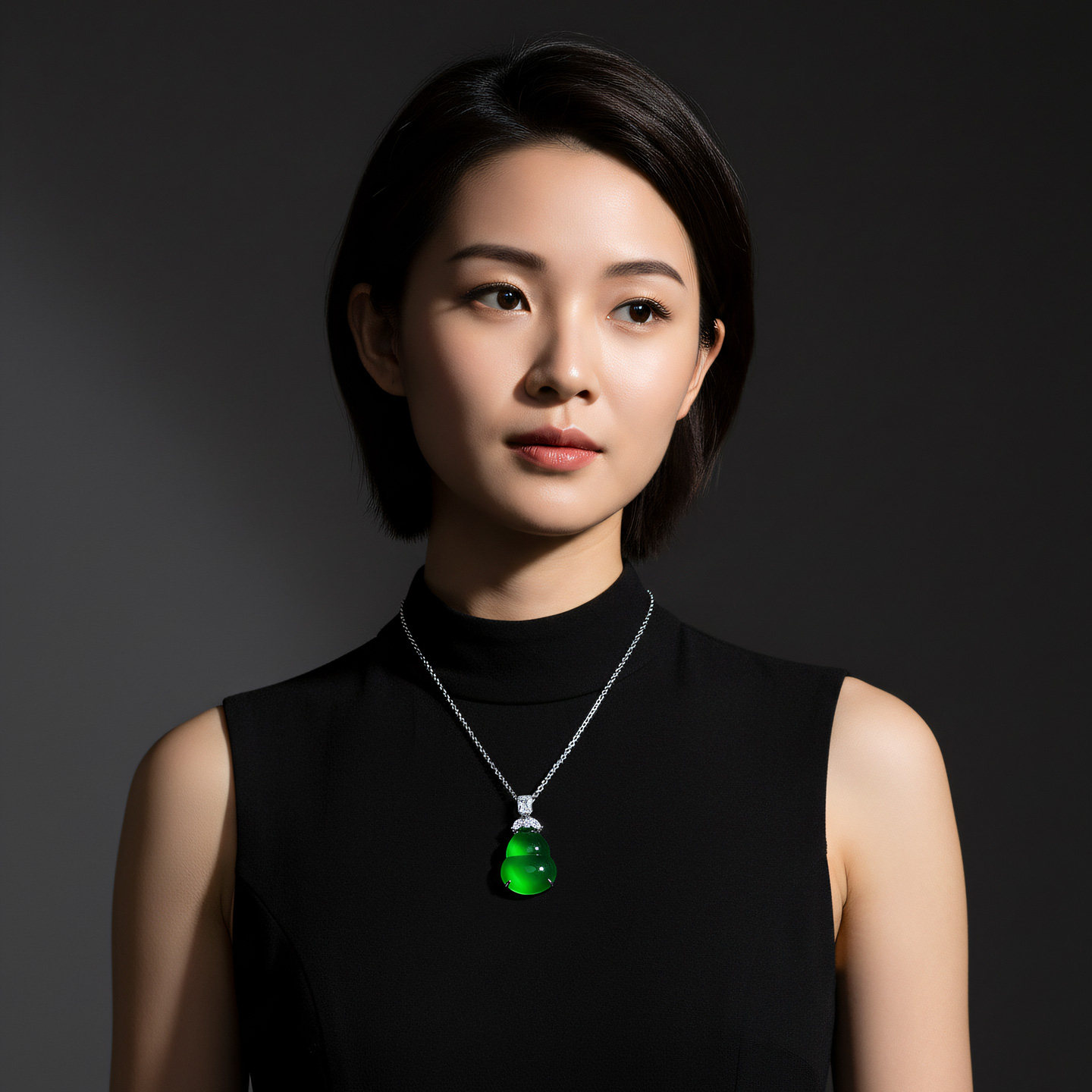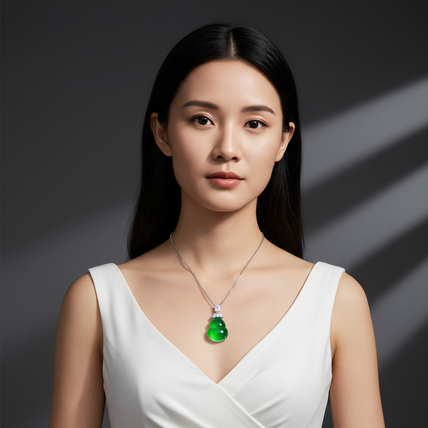 AILEQ 925银镶天然玉髓满绿福禄葫芦吊坠媲美翡翠时尚珠宝项链K10