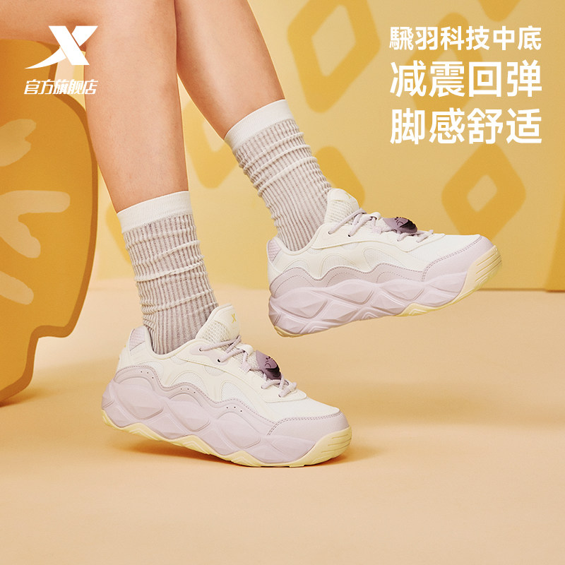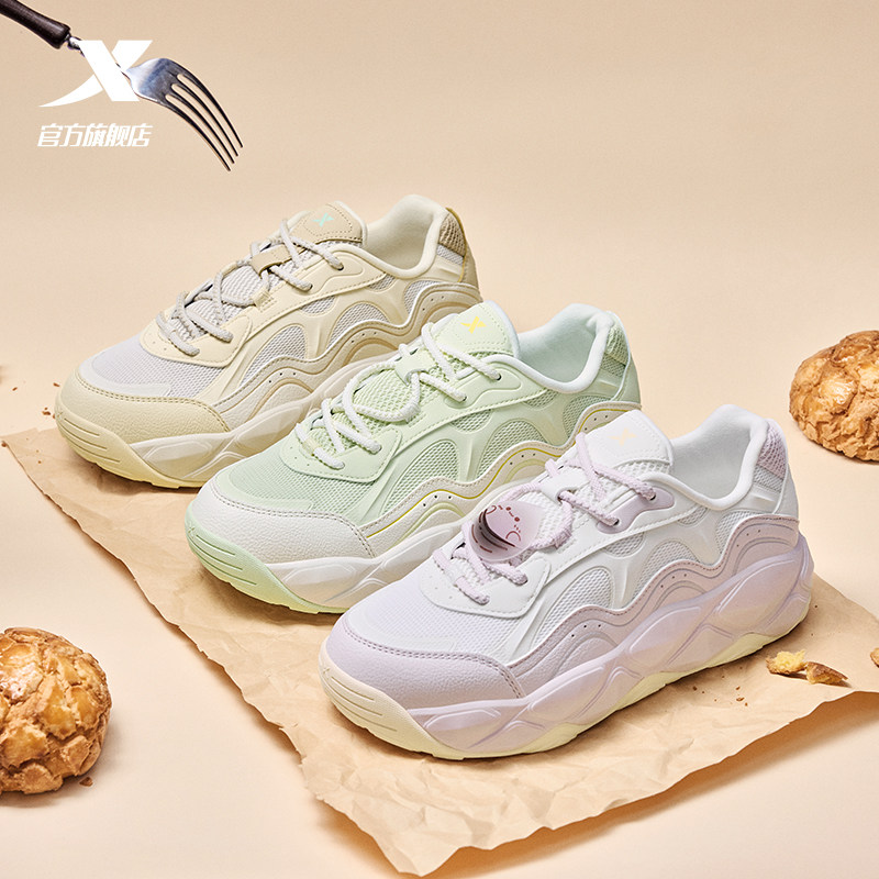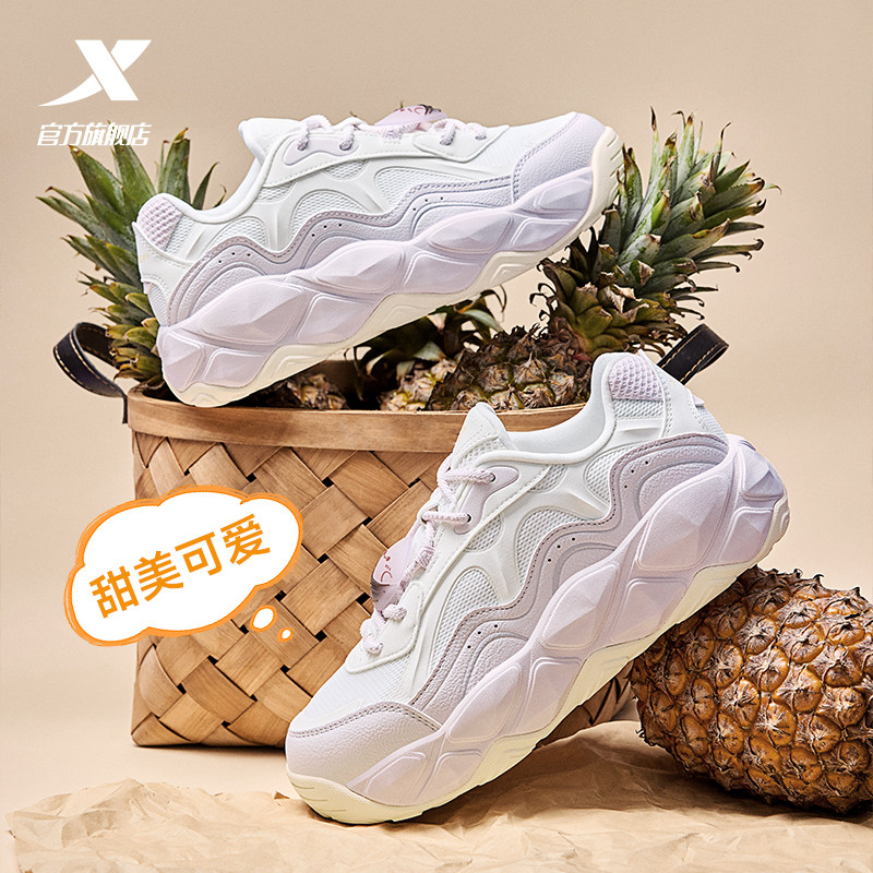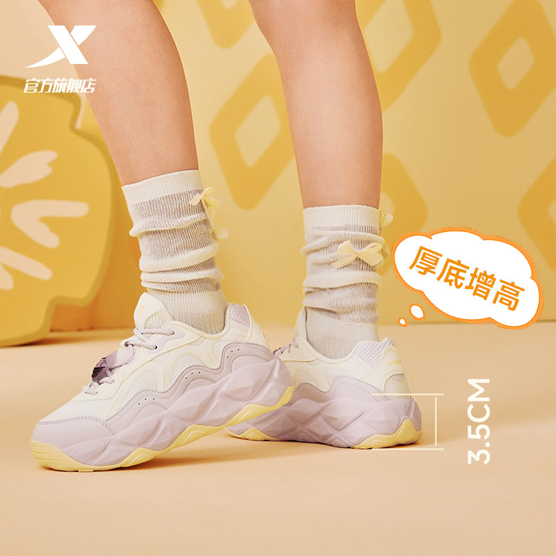 特步小菠萝女鞋冬季革网厚底增高休闲鞋百搭轻便运动鞋老爹面包鞋