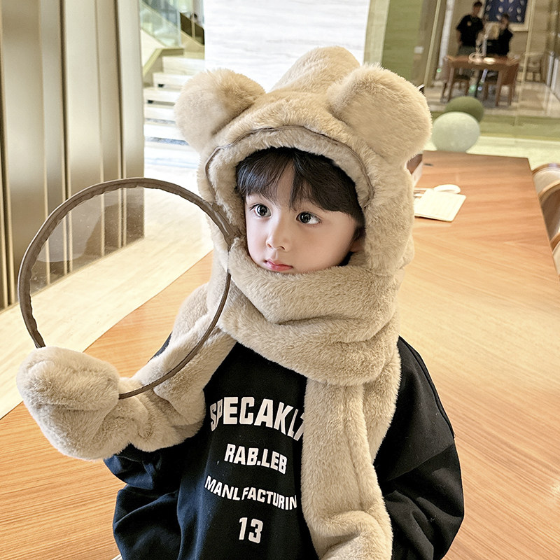 尼多熊儿童帽子围巾一体冬季防风帽宝宝毛绒护耳帽女童加厚保暖帽