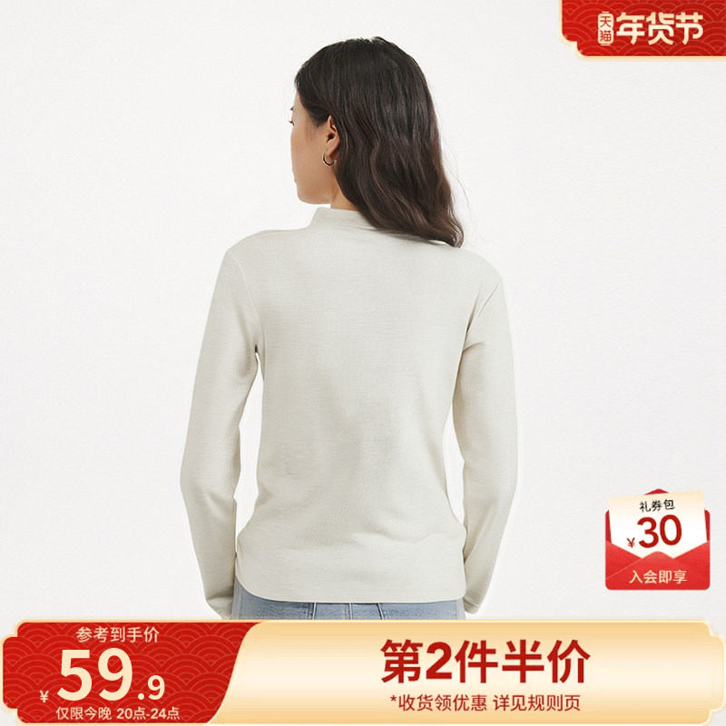蕉下亨利衫女长袖T恤v领秋冬修身保暖低领打底衫半开领白色上衣