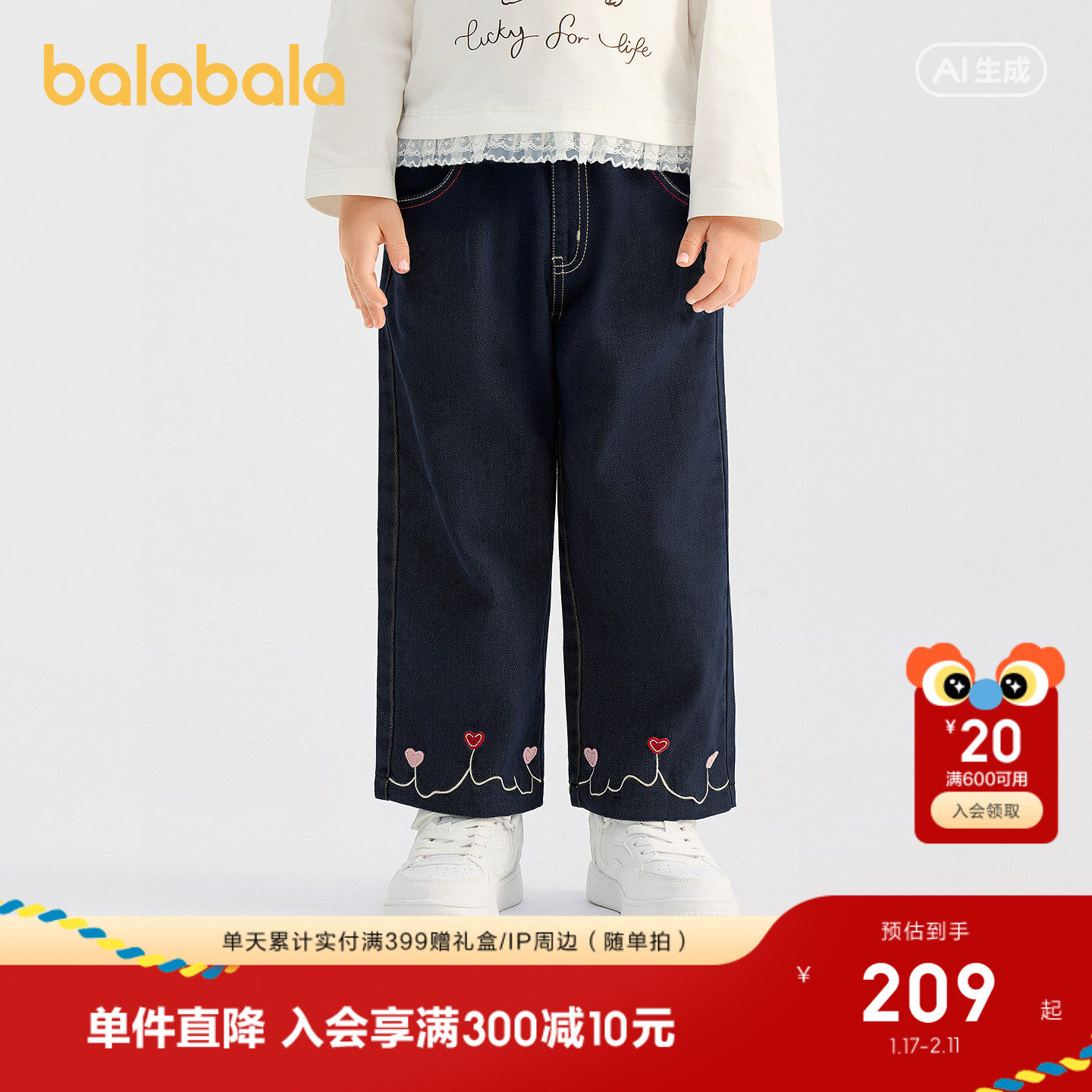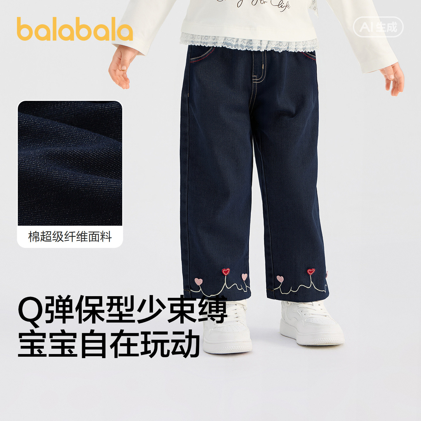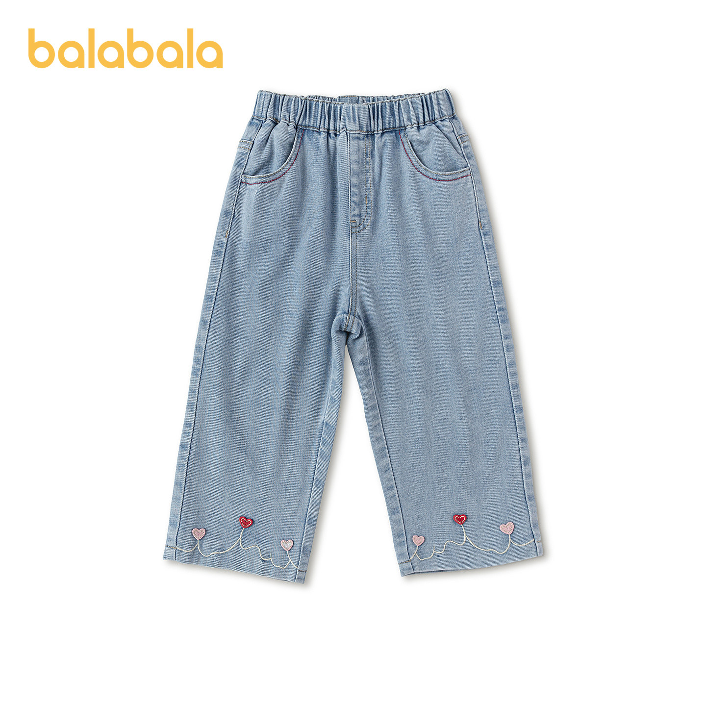 【商场同款】巴拉巴拉童装儿童长裤女童2026新春装爱心绣花牛仔裤