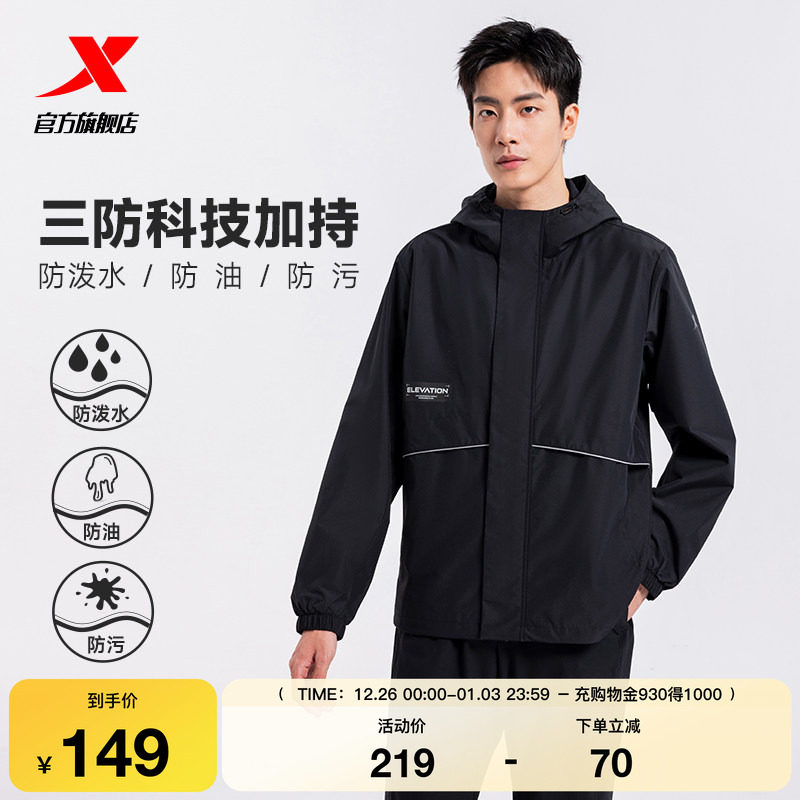 特步防泼水夹克外套男春秋季户外风衣连帽黑色上衣防风运动训练服