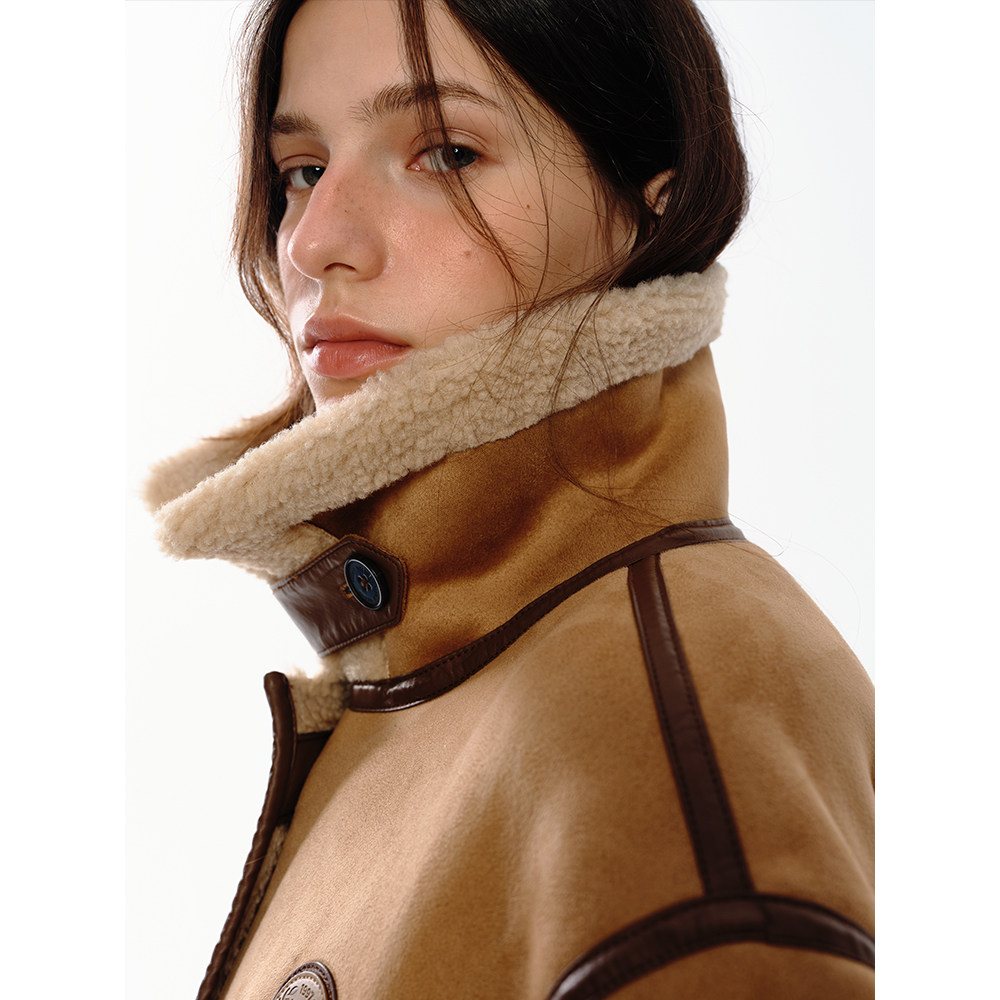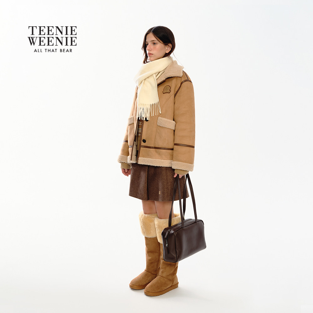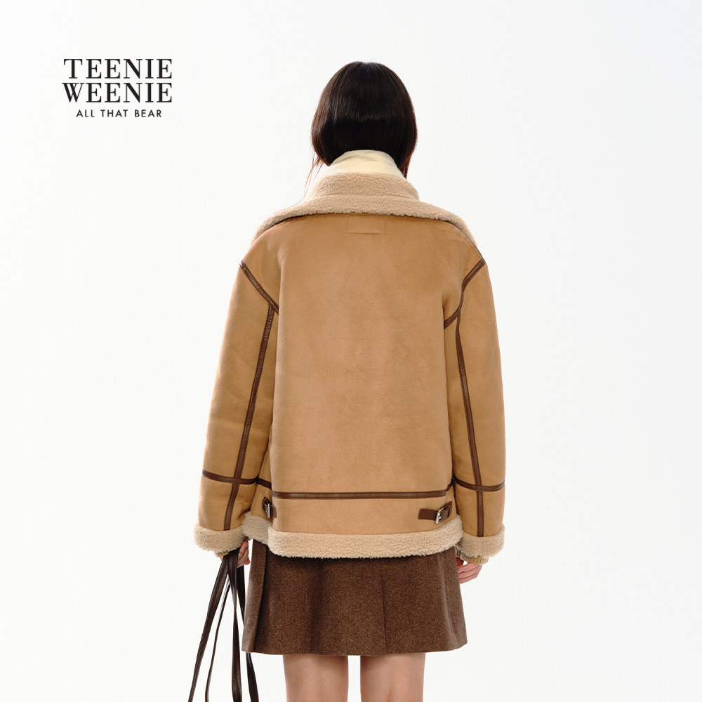 TeenieWeenie小熊女装秋冬复古酷飒仿麂皮驼色毛绒立领保暖外套