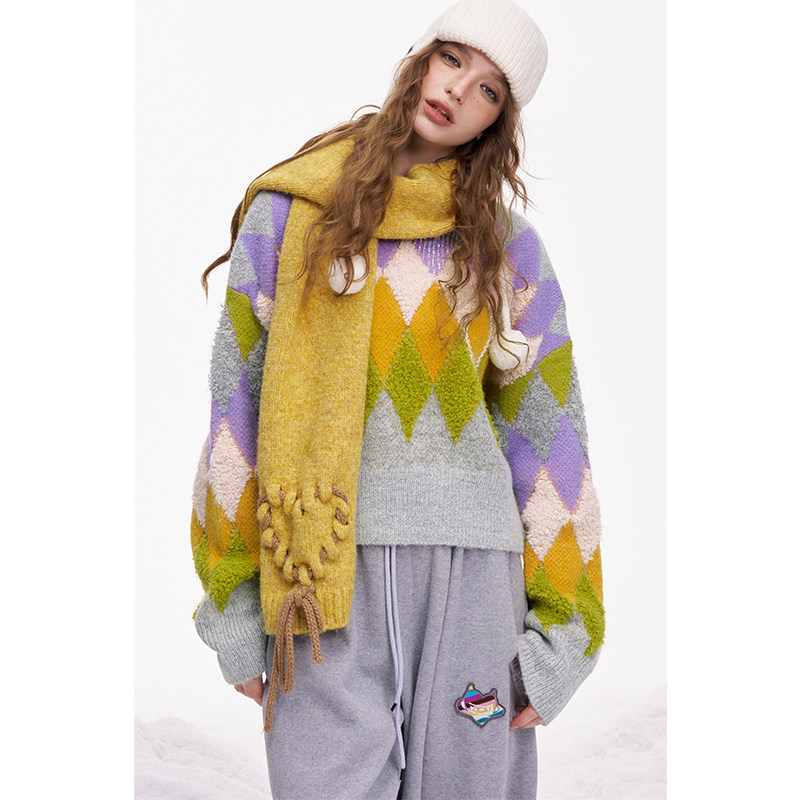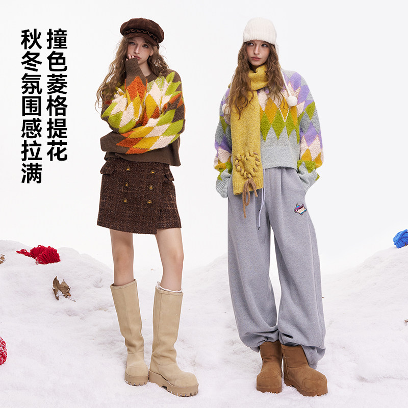 妖精的口袋复古撞色菱格提花毛衣女2025年冬季新款绵羊毛新年穿搭