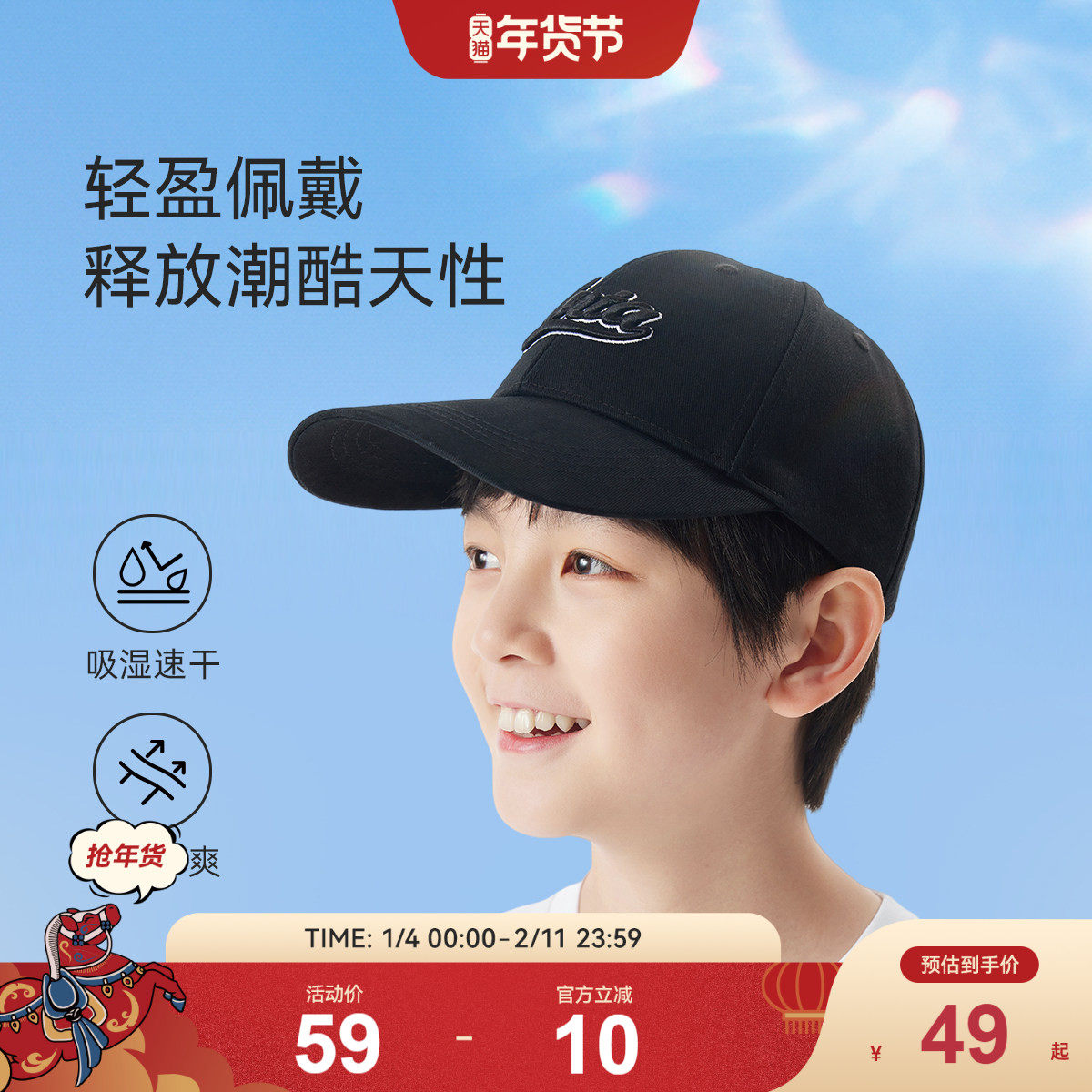 安踏儿童防晒帽子男童帽棒球帽户外运动遮阳帽2025新款宝宝帽子潮