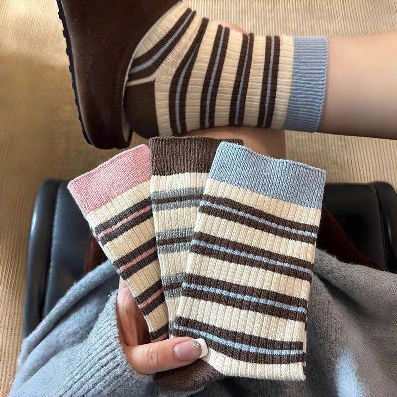 日系女袜彩边条纹袜子女春秋中筒袜薄款四季ins潮撞色多巴胺色系