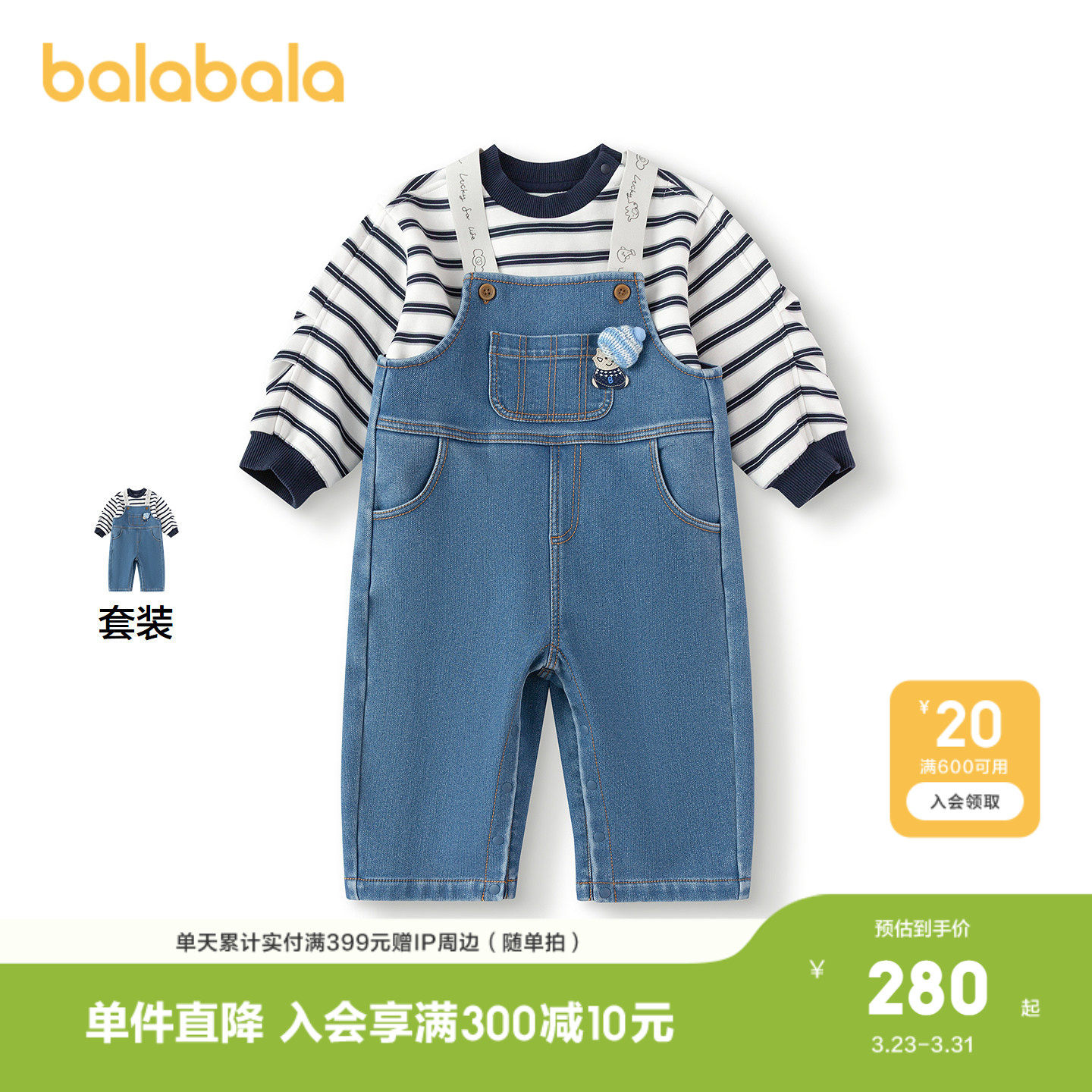 【商场同款】巴拉巴拉男童套装背带裤两件套秋冬童装加绒加厚保暖