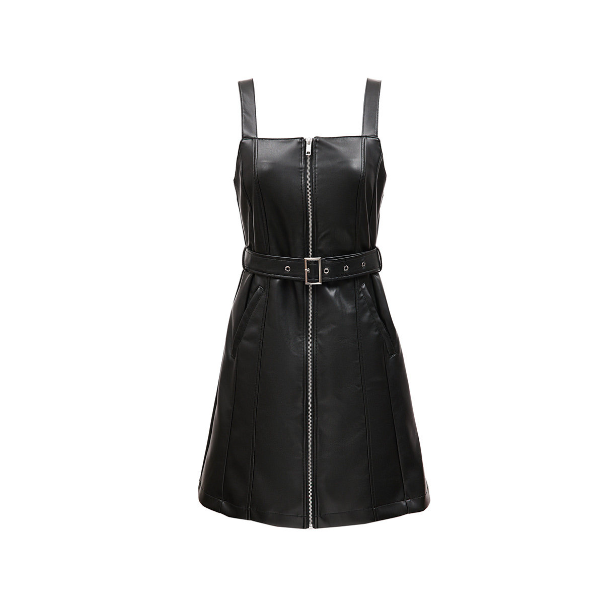 Vero Moda连衣裙秋冬PU仿皮前拉链收腰显瘦吊带裙设计感32437A039