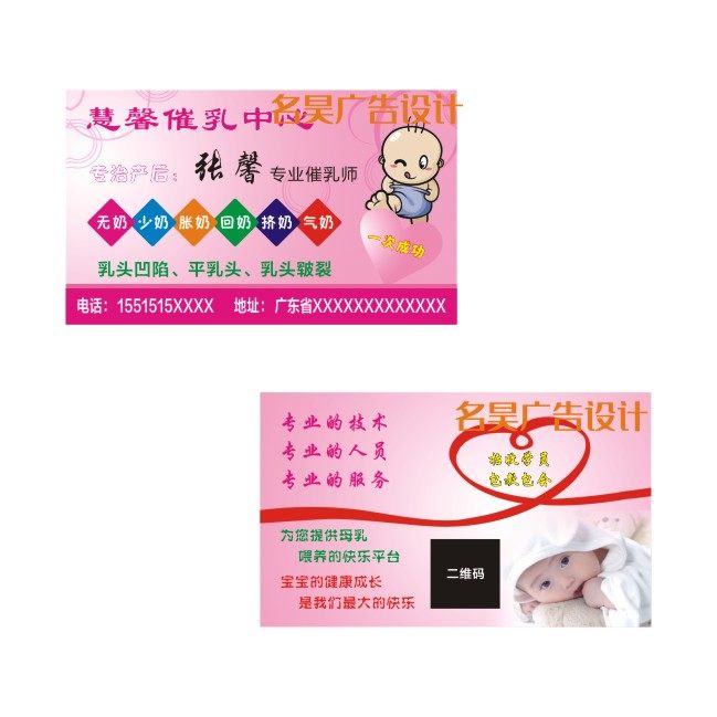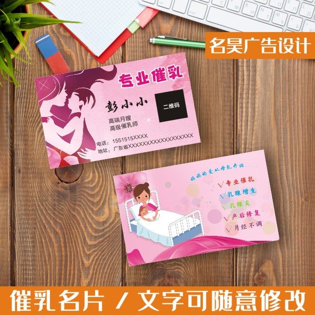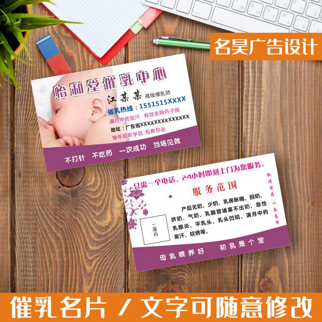 定制铜版纸催乳师名片免费设计新款家政上门服务少儿推拿卡片制作