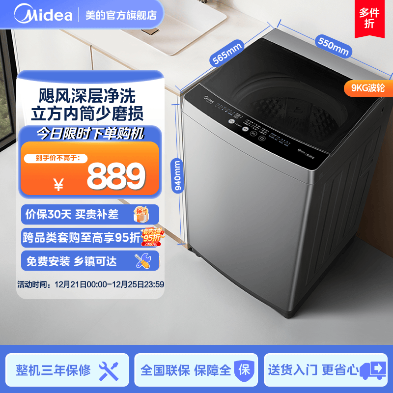 以旧换新补贴美的9kg波轮洗衣机全自动除螨家用租房宿舍洗脱一体