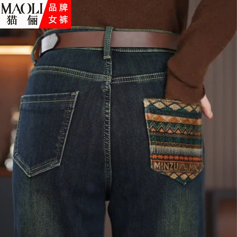 王家有鱼加绒复古微喇裤爆款时尚显瘦女裤2025秋冬新款百搭牛仔裤