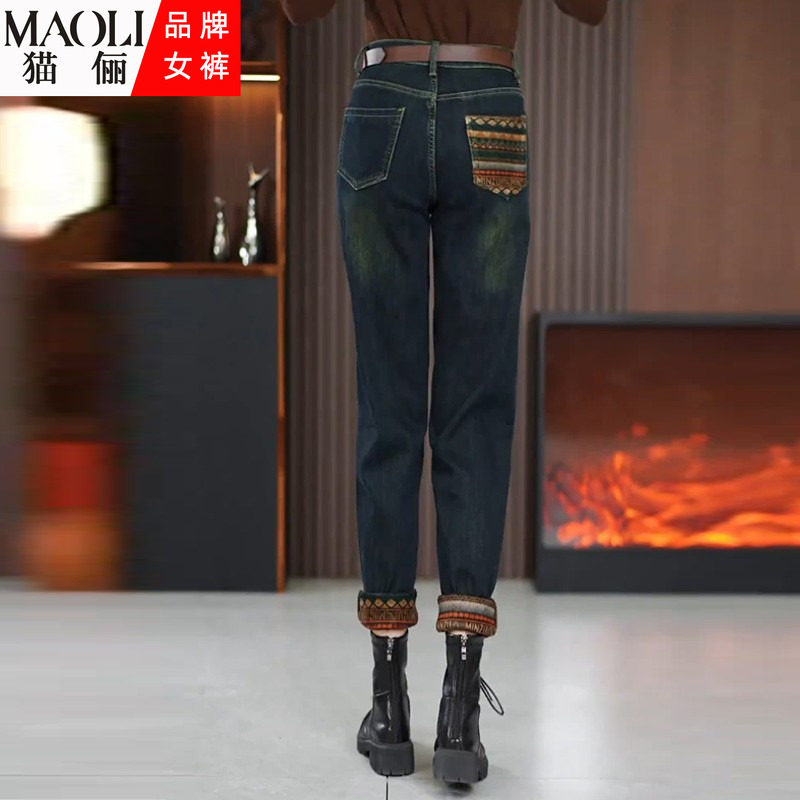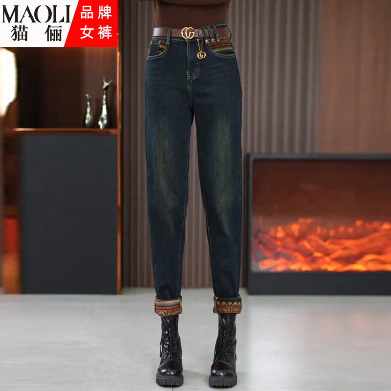 欧货加绒加厚牛仔裤女冬季新款大码胖mm梨形身材小个子直筒阔腿裤