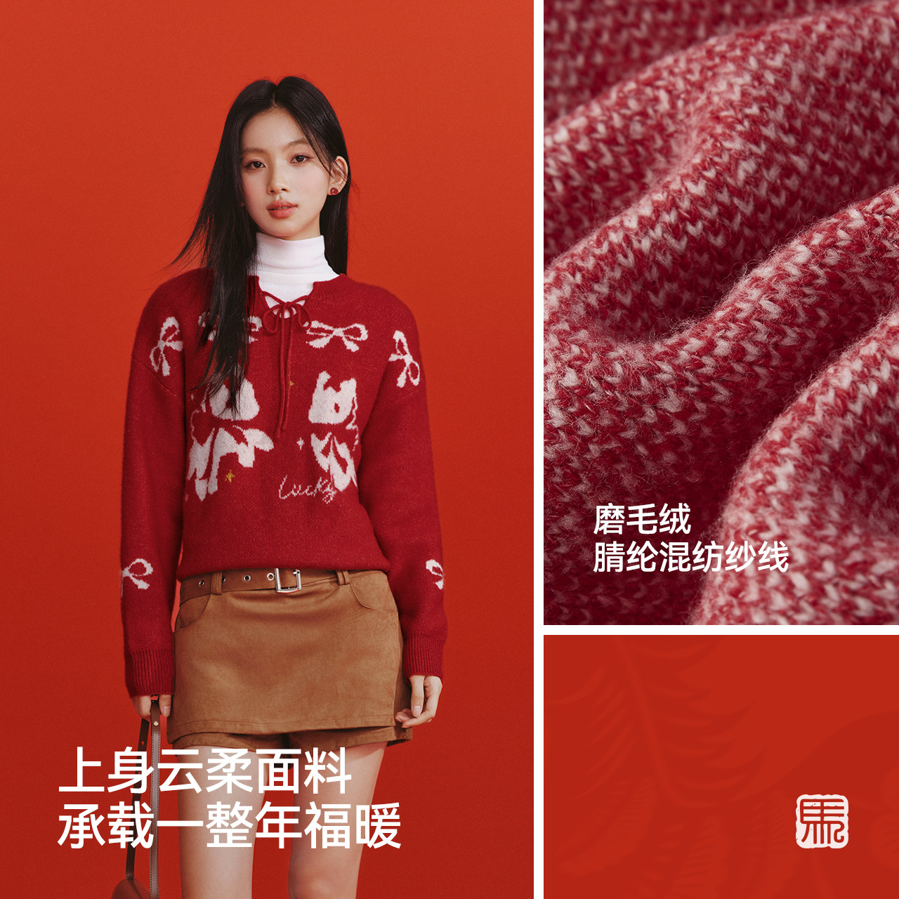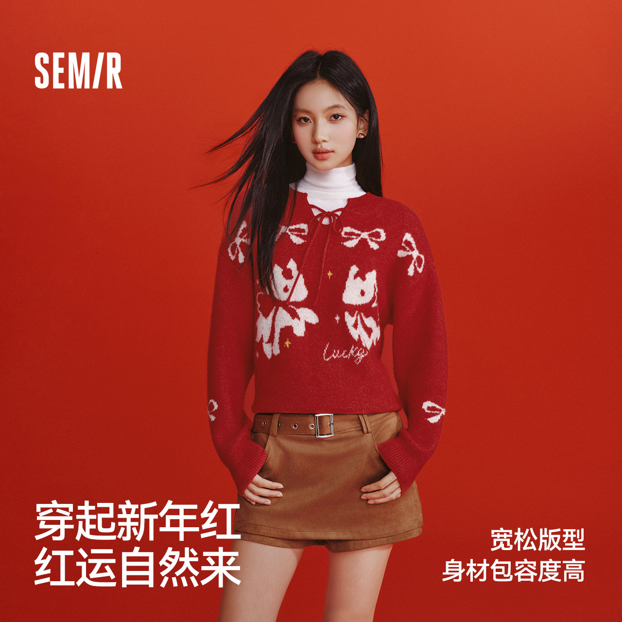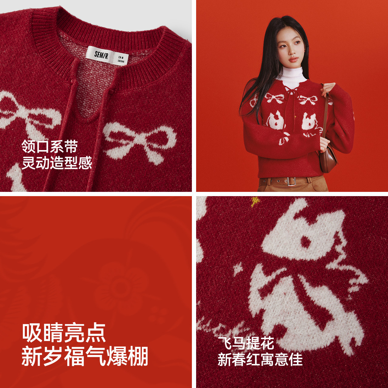 森马毛衣女春季提花蝴蝶结红色宽松2026新款少女感可爱马年套头衫