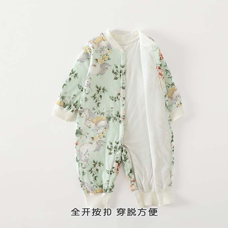 小猪大卫新生儿秋季保暖连体衣男女宝宝卡通印花中开夹棉爬服