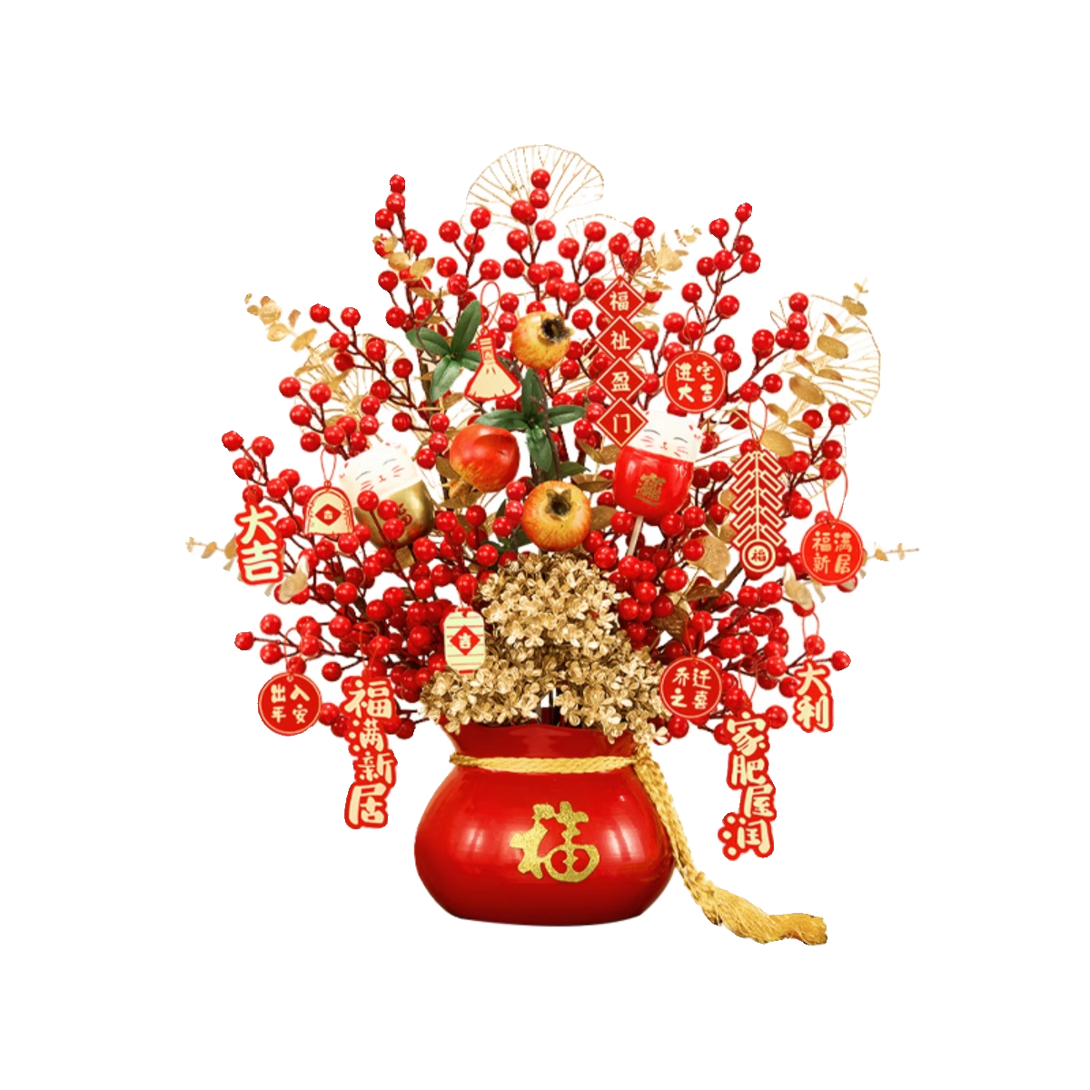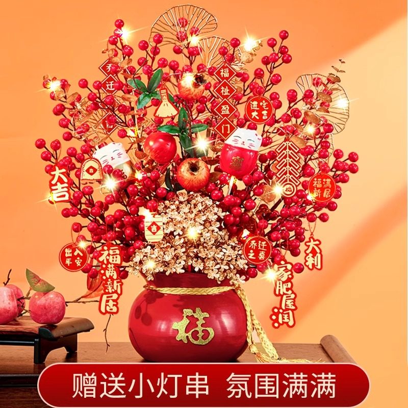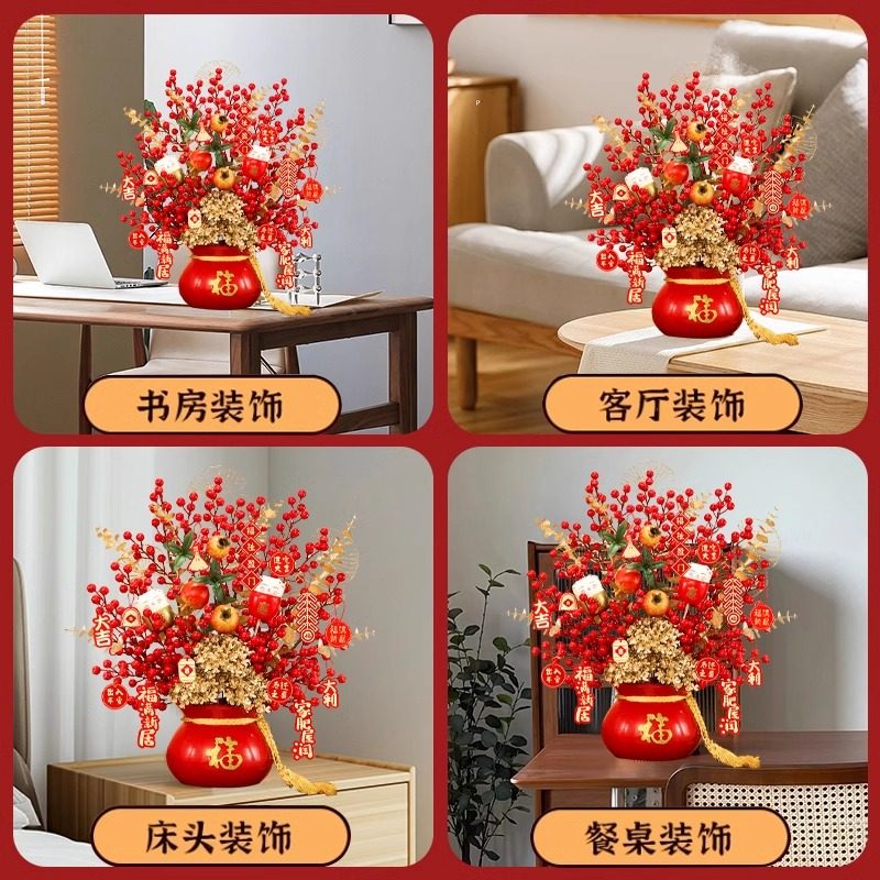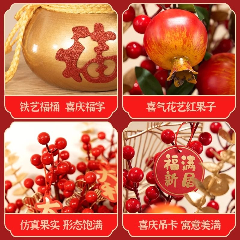 新年抱抱桶红果福桶年宵花仿真花乔迁客厅装饰摆件石榴柿子冬青