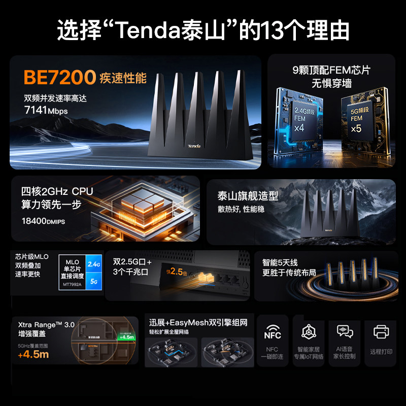 Tenda腾达路由器泰山旗舰B7200Ultra双2.5G口双频WiFi7四核高速穿墙信号放大器游戏电竞mesh组网be12pro