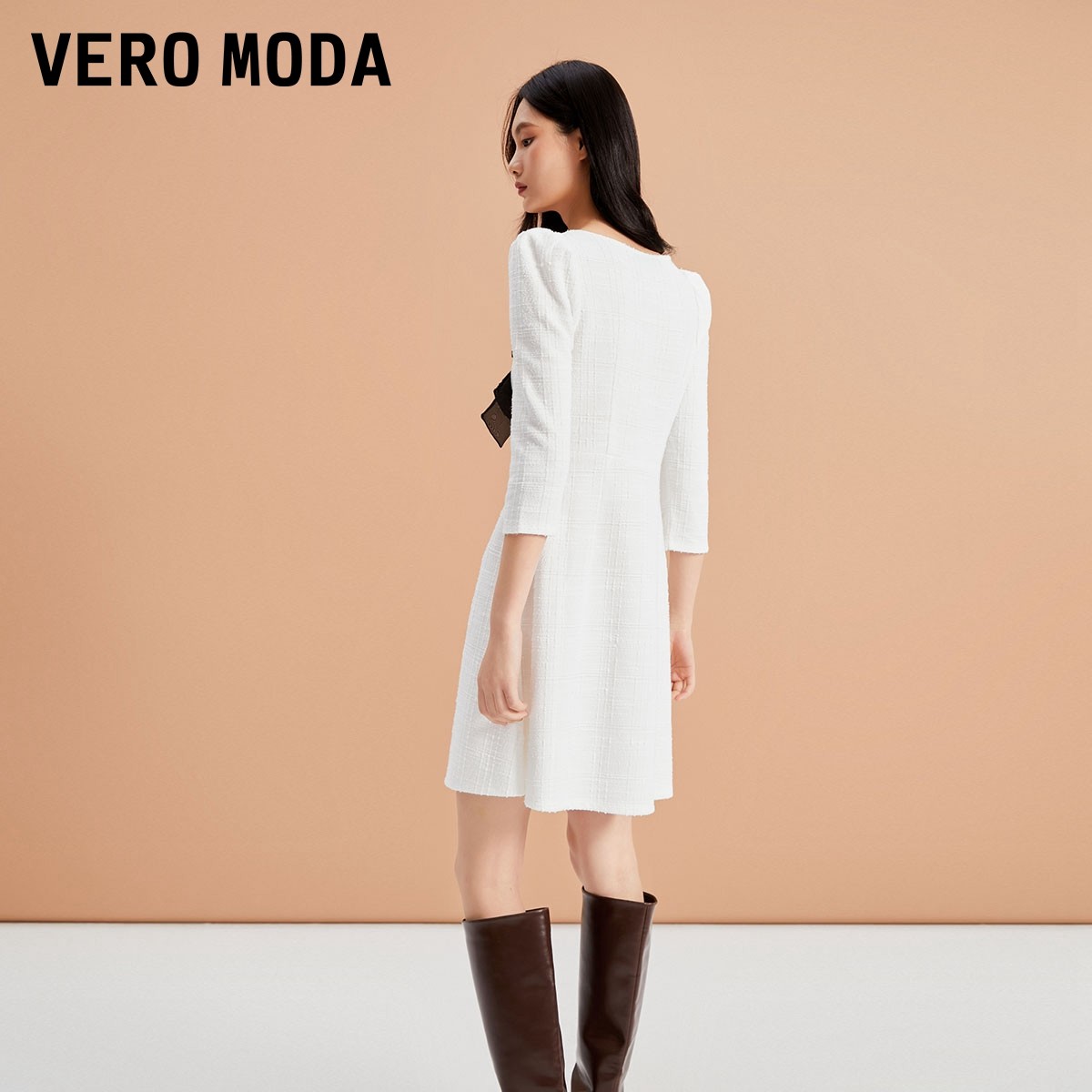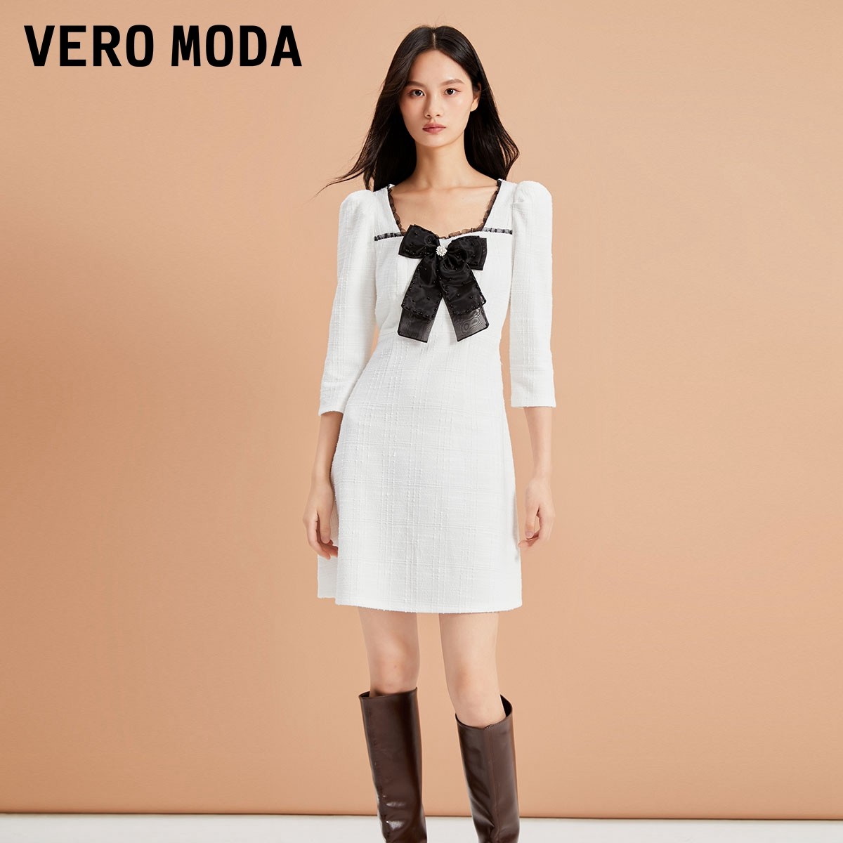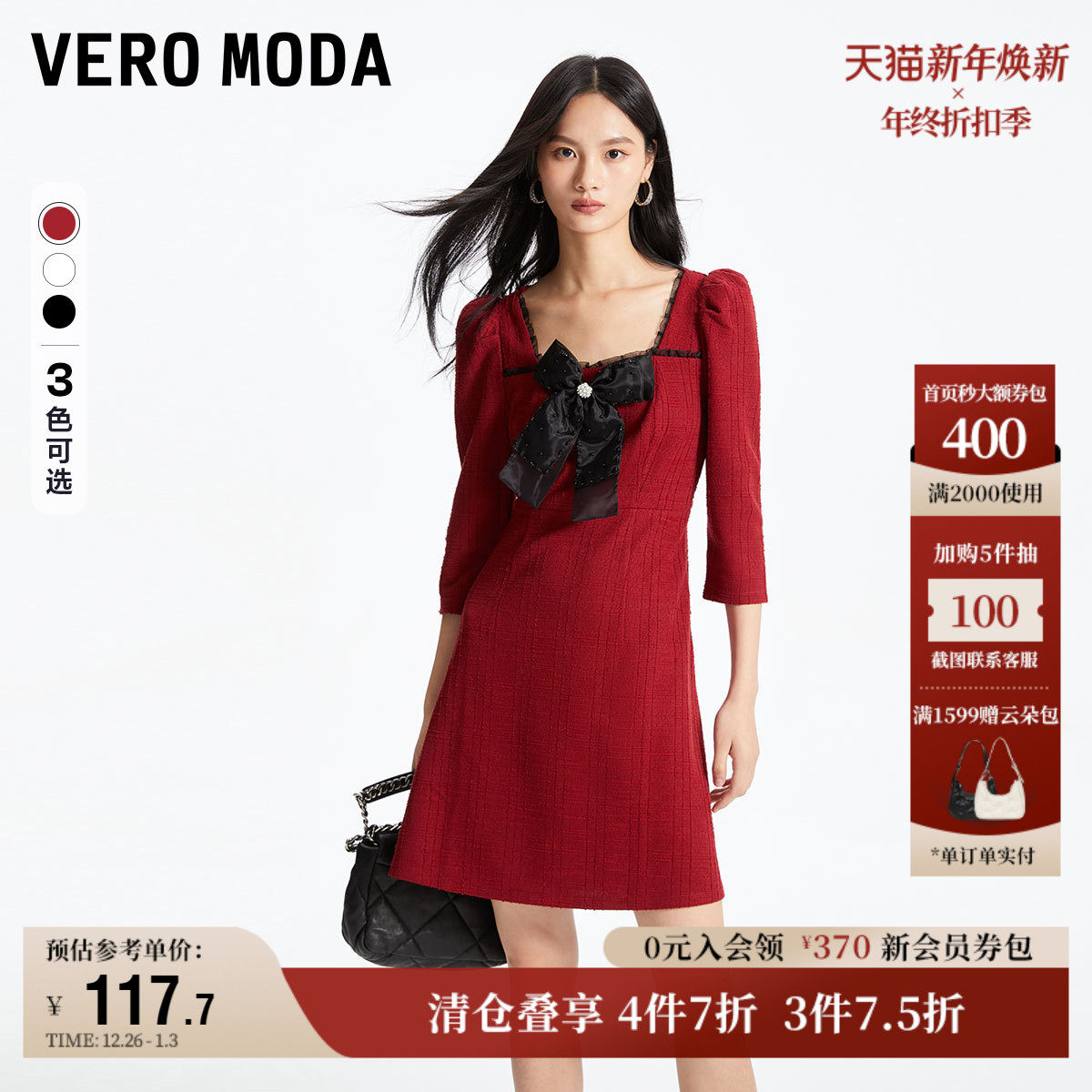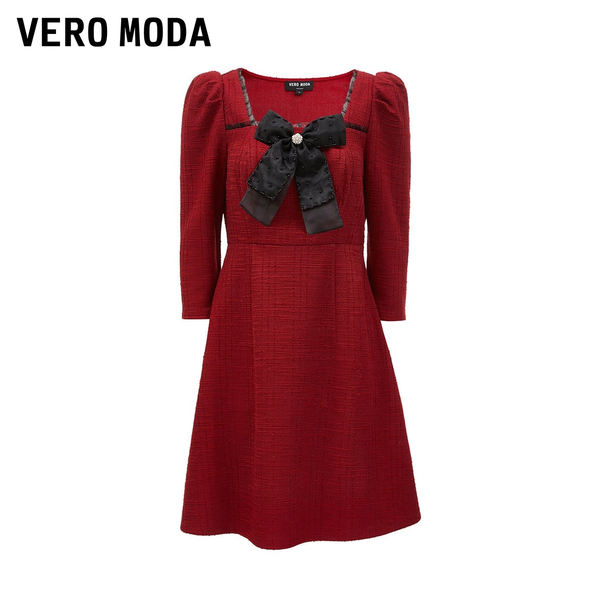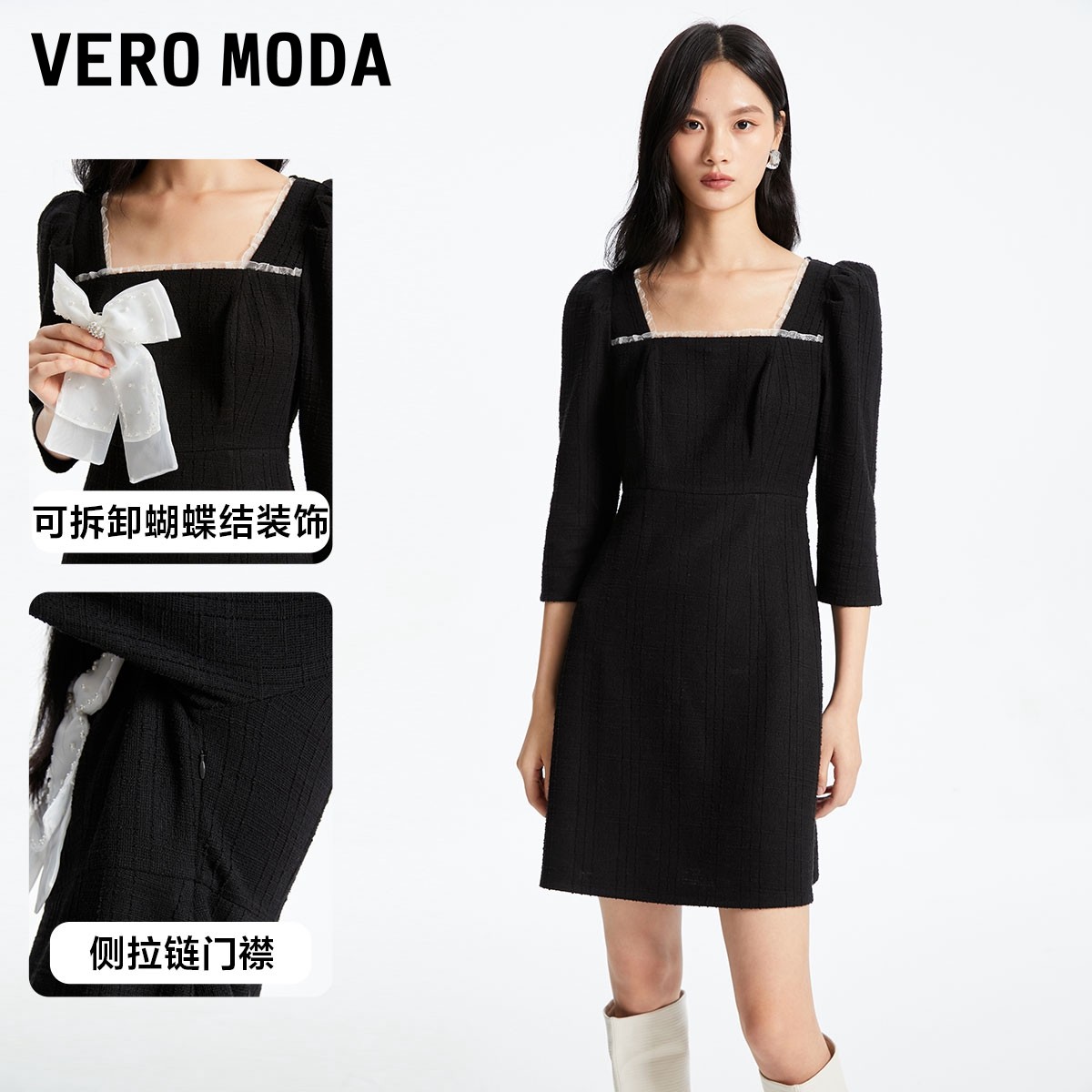 Vero Moda奥莱连衣裙子秋冬清仓优雅甜美小香风方领七分袖女百搭