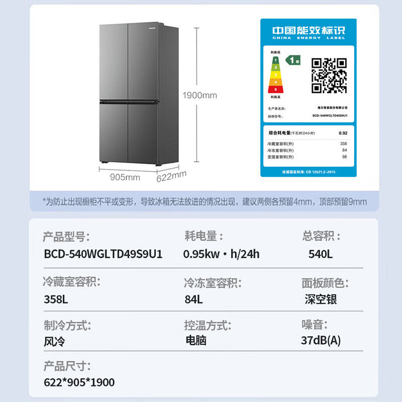 leader海尔冰箱零嵌式家用大容量540L十字四开门一级风冷无霜超薄